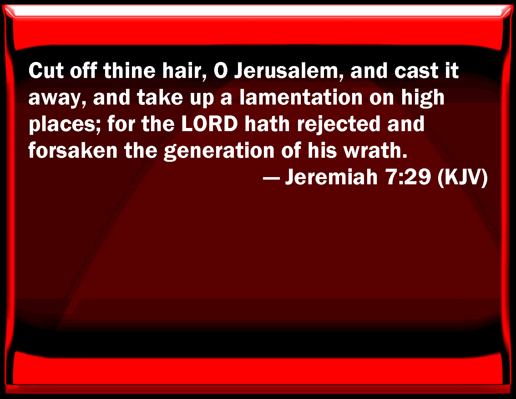 Bible Verse Slide Jeremiah 7:29 Cut off your hair, O Jerusalem, and cast it away, and take up a lamentation on high places; for the LORD has rejected and forsaken the generation of his wrath. KJV: Cut off thine hair, O Jerusalem, and cast it away, and take up a lamentation on high places; for the LORD hath rejected and forsaken the generation of his wrath. DRB: Cut off thy hair, and cast it away: and take up a lamentation on high: for the Lord hath rejected and forsaken the generation of his wrath, DBT: Cut off thy hair, and cast it away, and take up a lamentation on the heights; for Jehovah hath rejected and forsaken the generation of his wrath. ERV: Cut off thine hair, O Jerusalem, and cast it away, and take up a lamentation on the bare heights; for the LORD hath rejected and forsaken the generation of his wrath. WBT: Cut off thy hair, O Jerusalem, and cast it away, and take up a lamentation on high places; for the LORD hath rejected and forsaken the generation of his wrath. WEB: Cut off your hair, [Jerusalem], and cast it away, and take up a lamentation on the bare heights; for Yahweh has rejected and forsaken the generation of his wrath. YLT: Cut off thy crown, and cast it away, And lift up on high places lamentation, For Jehovah hath rejected, And He leaveth the generation of His wrath.Links Jeremiah 7:29 NIV • Jeremiah 7:29 NLT • Jeremiah 7:29 ESV • Jeremiah 7:29 NASB • Jeremiah 7:29 KJV • Jeremiah 7:29 Interlinear • Jeremiah 7:29 Commentaries • Jeremiah 7:29 Parallel Texts • Jeremiah 7:29 Bible Apps • Jeremiah 7:29 Parallel • Bible Hub |