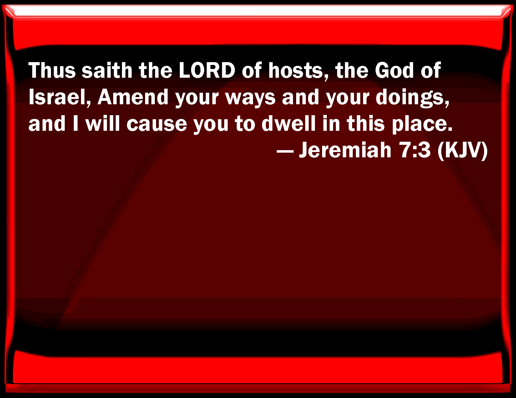 Bible Verse Slide Jeremiah 7:3 Thus said the LORD of hosts, the God of Israel, Amend your ways and your doings, and I will cause you to dwell in this place. KJV: Thus saith the LORD of hosts, the God of Israel, Amend your ways and your doings, and I will cause you to dwell in this place. DRB: Thus saith the Lord of hosts the God of Israel: Make your ways and your doings good: and I will dwell with you in this place. DBT: Thus saith Jehovah of hosts, the God of Israel: Amend your ways and your doings, and I will cause you to dwell in this place. ERV: Thus saith the LORD of hosts, the God of Israel, Amend your ways and your doings, and I will cause you to dwell in this place. WBT: Thus saith the LORD of hosts, the God of Israel, Amend your ways and your doings, and I will cause you to dwell in this place. WEB: Thus says Yahweh of Armies, the God of Israel, Amend your ways and your doings, and I will cause you to dwell in this place. YLT: Thus said Jehovah of Hosts, God of Israel, Amend your ways, and your doings, And I cause you to dwell in this place.Links Jeremiah 7:3 NIV • Jeremiah 7:3 NLT • Jeremiah 7:3 ESV • Jeremiah 7:3 NASB • Jeremiah 7:3 KJV • Jeremiah 7:3 Interlinear • Jeremiah 7:3 Commentaries • Jeremiah 7:3 Parallel Texts • Jeremiah 7:3 Bible Apps • Jeremiah 7:3 Parallel • Bible Hub |