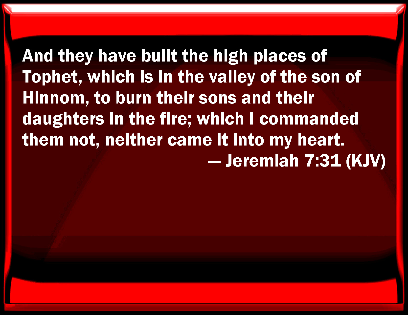 Bible Verse Slide Jeremiah 7:31 And they have built the high places of Tophet, which is in the valley of the son of Hinnom, to burn their sons and their daughters in the fire; which I commanded them not, neither came it into my heart. KJV: And they have built the high places of Tophet, which is in the valley of the son of Hinnom, to burn their sons and their daughters in the fire; which I commanded them not, neither came it into my heart. DRB: And they have built the high places of Topeth, which is in the valley of the son of Ennom, to burn their sons, and their daughters in the fire: which I commanded not, nor thought on in my heart. DBT: And they have built the high places of Topheth, which is in the valley of the son of Hinnom, to burn their sons and their daughters in the fire; which I commanded not, neither did it come up into my mind. ERV: And they have built the high places of Topheth, which is in the valley of the son of Hinnom, to burn their sons and their daughters in the fire; which I commanded not, neither came it into my mind. WBT: And they have built the high places of Tophet, which is in the valley of the son of Hinnom, to burn their sons and their daughters in the fire; which I commanded them not, neither came it into my heart. WEB: They have built the high places of Topheth, which is in the valley of the son of Hinnom, to burn their sons and their daughters in the fire; which I didn't command, nor did it come into my mind. YLT: And have built the high places of Tophet, That are in the valley of the son of Hinnom, To burn their sons and their daughters with fire, Which I did not command, Nor did it come up on My heart.Links Jeremiah 7:31 NIV • Jeremiah 7:31 NLT • Jeremiah 7:31 ESV • Jeremiah 7:31 NASB • Jeremiah 7:31 KJV • Jeremiah 7:31 Interlinear • Jeremiah 7:31 Commentaries • Jeremiah 7:31 Parallel Texts • Jeremiah 7:31 Bible Apps • Jeremiah 7:31 Parallel • Bible Hub |