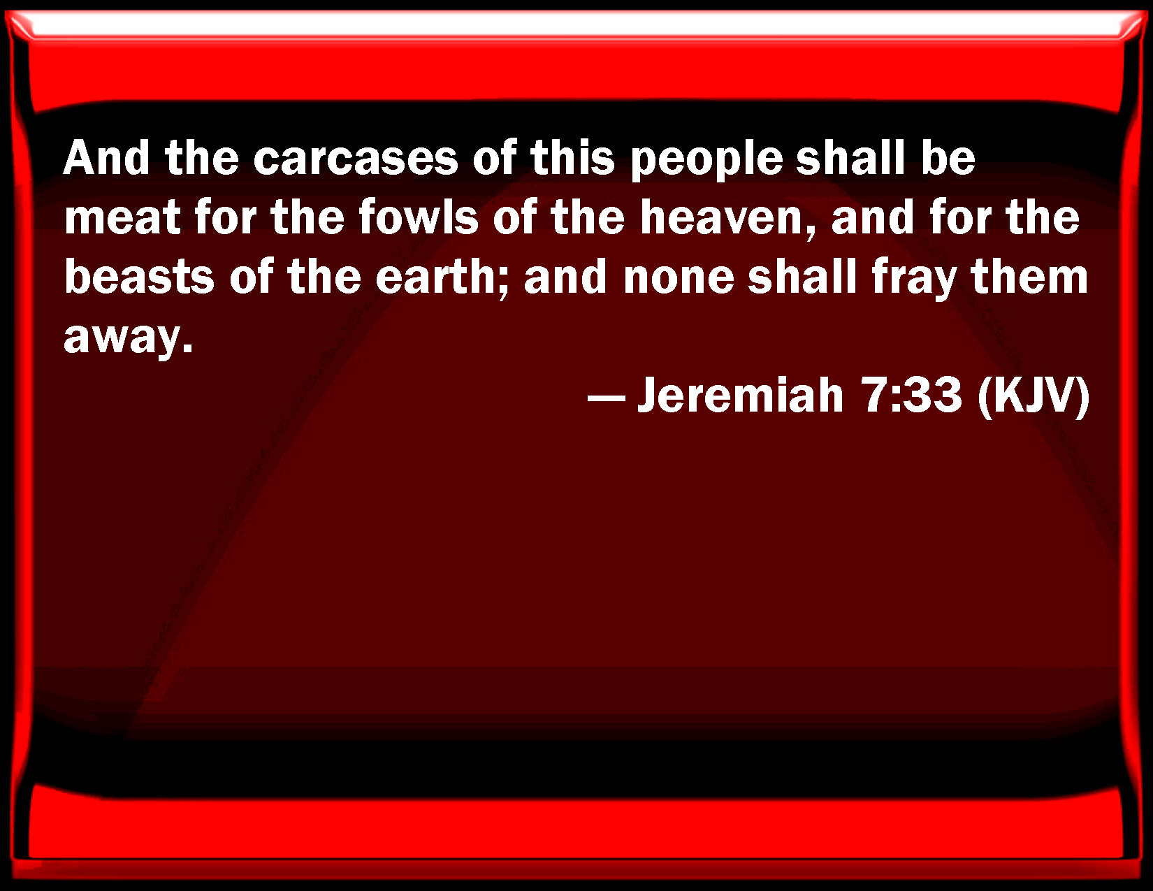 Bible Verse Slide Jeremiah 7:33 And the carcasses of this people shall be meat for the fowls of the heaven, and for the beasts of the earth; and none shall fray them away. KJV: And the carcases of this people shall be meat for the fowls of the heaven, and for the beasts of the earth; and none shall fray them away. DRB: And the carcasses of this people shall be meat for the fowls of the air, and for the beasts of the earth, and there shall be none to drive them away. DBT: And the carcases of this people shall be food for the fowl of the heavens, and for the beasts of the earth; and none shall scare them away. ERV: And the carcases of this people shall be meat for the fowls of the heaven, and for the beasts of the earth; and none shall fray them away. WBT: And the carcasses of this people shall be food for the fowls of heaven, and for the beasts of the earth; and none shall frighten them away. WEB: The dead bodies of this people shall be food for the birds of the sky, and for the animals of the earth; and none shall frighten them away. YLT: And the carcase of this people hath been for food To a fowl of the heavens, and to a beast of the earth, And there is none troubling.Links Jeremiah 7:33 NIV • Jeremiah 7:33 NLT • Jeremiah 7:33 ESV • Jeremiah 7:33 NASB • Jeremiah 7:33 KJV • Jeremiah 7:33 Interlinear • Jeremiah 7:33 Commentaries • Jeremiah 7:33 Parallel Texts • Jeremiah 7:33 Bible Apps • Jeremiah 7:33 Parallel • Bible Hub |
