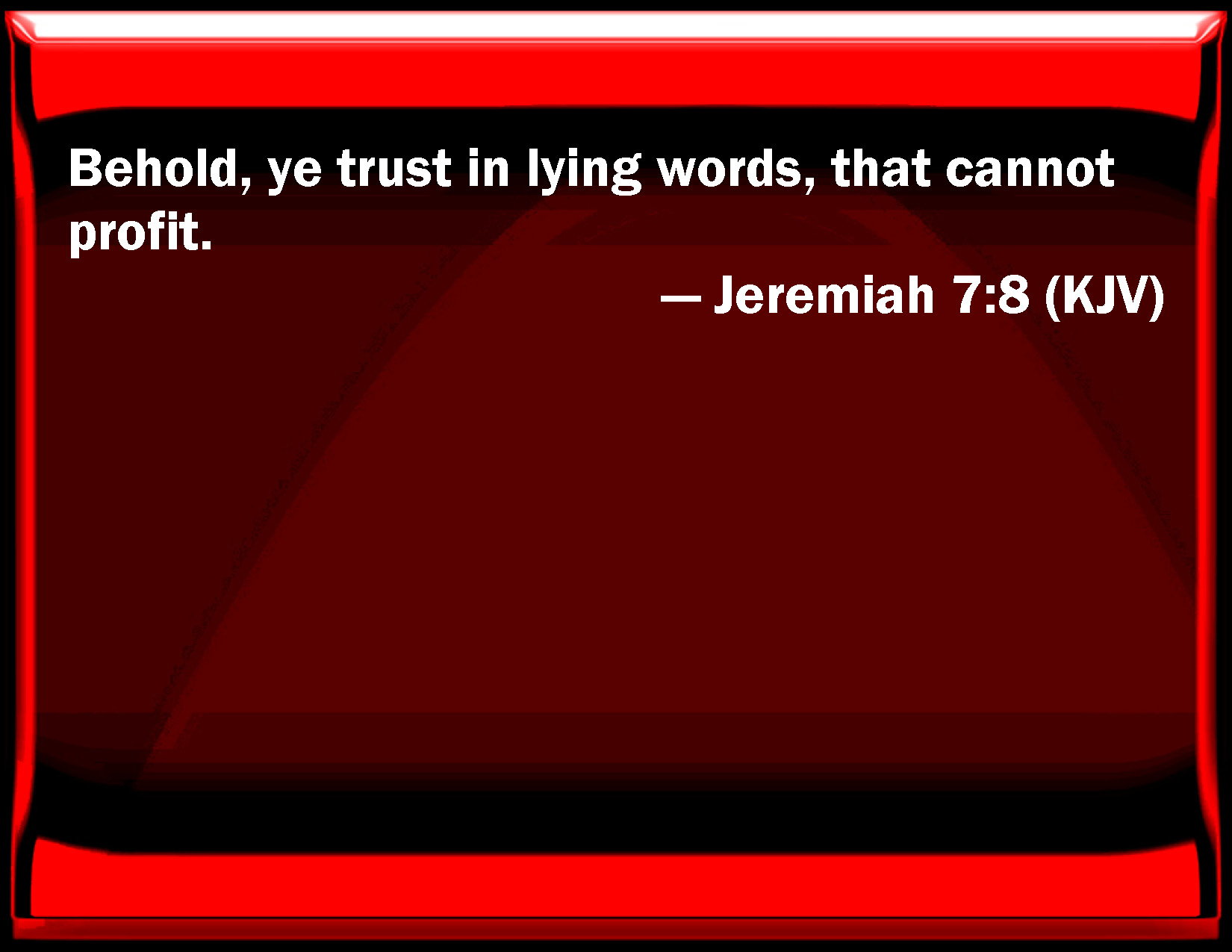 Bible Verse Slide Jeremiah 7:8 Behold, you trust in lying words, that cannot profit. KJV: Behold, ye trust in lying words, that cannot profit. DRB: Behold you put your trust in lying words, which shall not profit you: DBT: Behold, ye confide in words of falsehood that cannot profit. ERV: Behold, ye trust in lying words, that cannot profit. WBT: Behold, ye trust in lying words, that cannot profit. WEB: Behold, you trust in lying words, that can't profit. YLT: Lo, ye are trusting for yourselves On the words of falsehood, so as not to profit.Links Jeremiah 7:8 NIV • Jeremiah 7:8 NLT • Jeremiah 7:8 ESV • Jeremiah 7:8 NASB • Jeremiah 7:8 KJV • Jeremiah 7:8 Interlinear • Jeremiah 7:8 Commentaries • Jeremiah 7:8 Parallel Texts • Jeremiah 7:8 Bible Apps • Jeremiah 7:8 Parallel • Bible Hub |