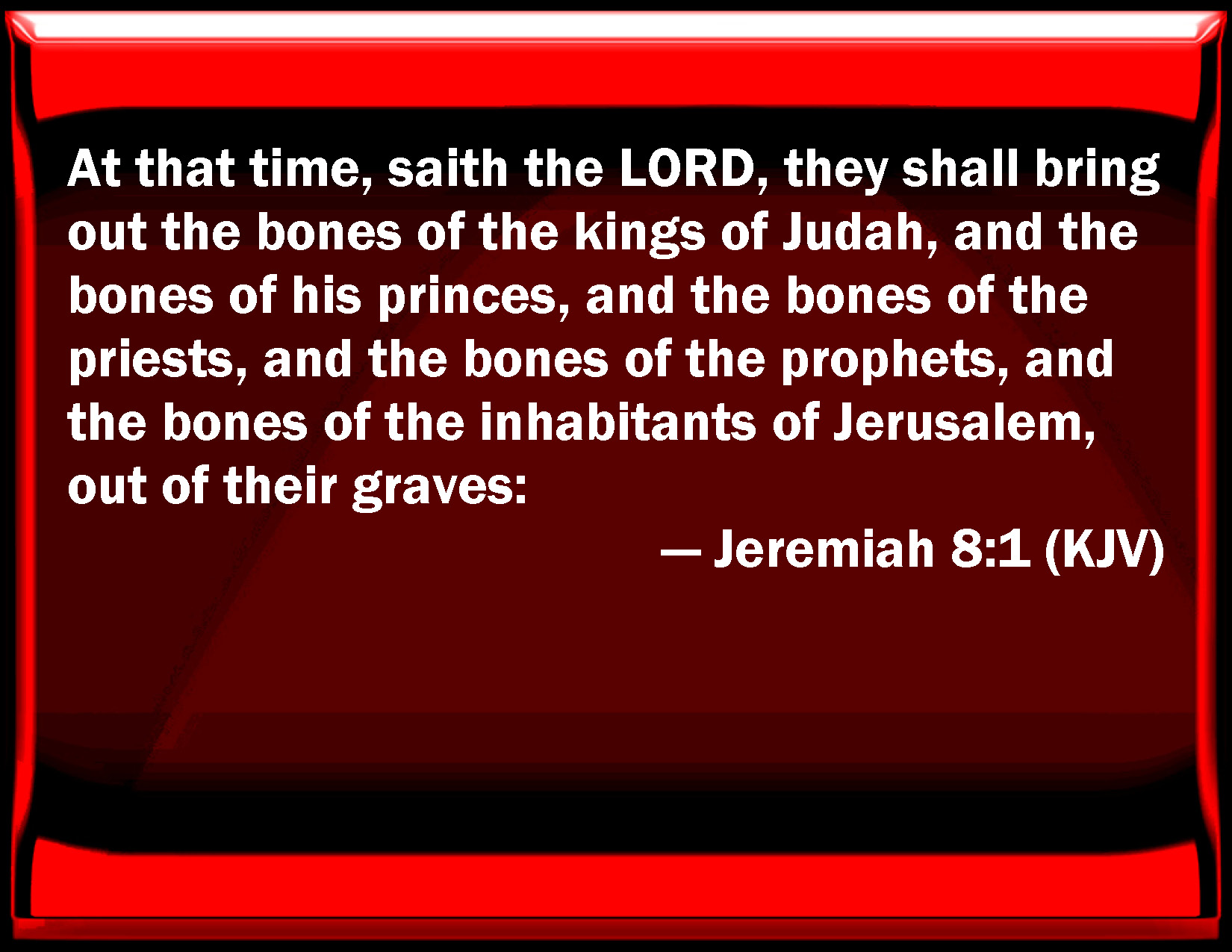 Bible Verse Slide Jeremiah 8:1 At that time, said the LORD, they shall bring out the bones of the kings of Judah, and the bones of his princes, and the bones of the priests, and the bones of the prophets, and the bones of the inhabitants of Jerusalem, out of their graves: KJV: At that time, saith the LORD, they shall bring out the bones of the kings of Judah, and the bones of his princes, and the bones of the priests, and the bones of the prophets, and the bones of the inhabitants of Jerusalem, out of their graves: DRB: At that time, saith the Lord, they shall cast out the bones of the kings of Juda, and the bones of the princes thereof, and the bones of the priests, and the bones of the inhabitants of Jerusalem, out of their graves. DBT: At that time, saith Jehovah, they shall bring forth the bones of the kings of Judah, and the bones of his princes, and the bones of the priests, and the bones of the prophets, and the bones of the inhabitants of Jerusalem, out of their graves; ERV: At that time, saith the LORD, they shall bring out the bones of the kings of Judah, and the bones of his princes, and the bones of the priests, and the bones of the prophets, and the bones of the inhabitants of Jerusalem, out of their graves: WBT: At that time, saith the LORD, they shall bring the bones of the kings of Judah, and the bones of his princes, and the bones of the priests, and the bones of the prophets, and the bones of the inhabitants of Jerusalem, out of their graves: WEB: At that time, says Yahweh, they shall bring out the bones of the kings of Judah, and the bones of his princes, and the bones of the priests, and the bones of the prophets, and the bones of the inhabitants of Jerusalem, out of their graves; YLT: At that time, an affirmation of Jehovah, They bring the bones of the kings of Judah, And the bones of its princes, And the bones of the priests, And the bones of the prophets, And the bones of inhabitants of Jerusalem, Out of their graves,Links Jeremiah 8:1 NIV • Jeremiah 8:1 NLT • Jeremiah 8:1 ESV • Jeremiah 8:1 NASB • Jeremiah 8:1 KJV • Jeremiah 8:1 Interlinear • Jeremiah 8:1 Commentaries • Jeremiah 8:1 Parallel Texts • Jeremiah 8:1 Bible Apps • Jeremiah 8:1 Parallel • Bible Hub |