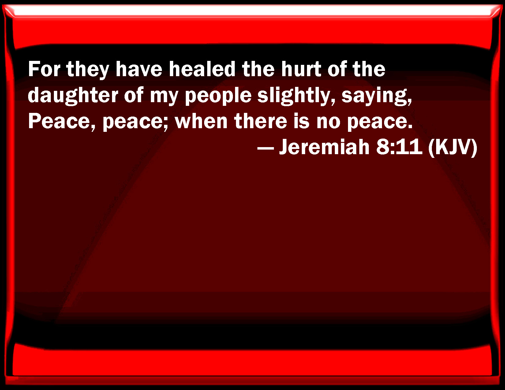 Bible Verse Slide Jeremiah 8:11 For they have healed the hurt of the daughter of my people slightly, saying, Peace, peace; when there is no peace. KJV: For they have healed the hurt of the daughter of my people slightly, saying, Peace, peace; when there is no peace. DRB: And they healed the breach of the daughter of my people disgracefully, saying Peace, peace: when there was no peace. DBT: And they have healed the breach of the daughter of my people lightly, saying, Peace, peace! when there is no peace. ERV: And they have healed the hurt of the daughter of my people lightly, saying, Peace, peace; when there is no peace. WBT: For they have healed the hurt of the daughter of my people slightly, saying, Peace, peace; when there is no peace. WEB: They have healed the hurt of the daughter of my people slightly, saying, Peace, peace; when there is no peace. YLT: And they heal the breach of the daughter of my people slightly, Saying, Peace, peace! and there is no peace.Links Jeremiah 8:11 NIV • Jeremiah 8:11 NLT • Jeremiah 8:11 ESV • Jeremiah 8:11 NASB • Jeremiah 8:11 KJV • Jeremiah 8:11 Interlinear • Jeremiah 8:11 Commentaries • Jeremiah 8:11 Parallel Texts • Jeremiah 8:11 Bible Apps • Jeremiah 8:11 Parallel • Bible Hub |