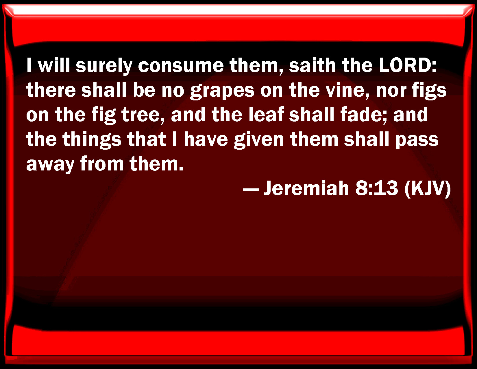 Bible Verse Slide Jeremiah 8:13 I will surely consume them, said the LORD: there shall be no grapes on the vine, nor figs on the fig tree, and the leaf shall fade; and the things that I have given them shall pass away from them. KJV: I will surely consume them, saith the LORD: there shall be no grapes on the vine, nor figs on the fig tree, and the leaf shall fade; and the things that I have given them shall pass away from them. DRB: Gathering I will gather them together, saith the Lord, there is no grape on the vines, and there are no figs on the fig tree, the leaf is fallen: and I have given them the things that are passed away. DBT: I will utterly take them away, saith Jehovah: there are no grapes on the vine, nor figs on the fig-tree; and the leaf is faded: and I will give them up to those that shall pass over them. ERV: I will utterly consume them, saith the LORD: there shall be no grapes on the vine, nor figs on the fig tree, and the leaf shall fade; and the things that I have given them shall pass away from them. WBT: I will surely consume them, saith the LORD: there shall be no grapes on the vine, nor figs on the fig-tree, and the leaf shall fade; and the things that I have given to them shall pass away from them. WEB: I will utterly consume them, says Yahweh: no grapes shall be on the vine, nor figs on the fig tree, and the leaf shall fade; and [the things that] I have given them shall pass away from them. YLT: I utterly consume them, an affirmation of Jehovah, There are no grapes in the vine, Yea, there are no figs in the fig-tree, And the leaf hath faded, And the strength they have passeth from them.Links Jeremiah 8:13 NIV • Jeremiah 8:13 NLT • Jeremiah 8:13 ESV • Jeremiah 8:13 NASB • Jeremiah 8:13 KJV • Jeremiah 8:13 Interlinear • Jeremiah 8:13 Commentaries • Jeremiah 8:13 Parallel Texts • Jeremiah 8:13 Bible Apps • Jeremiah 8:13 Parallel • Bible Hub |