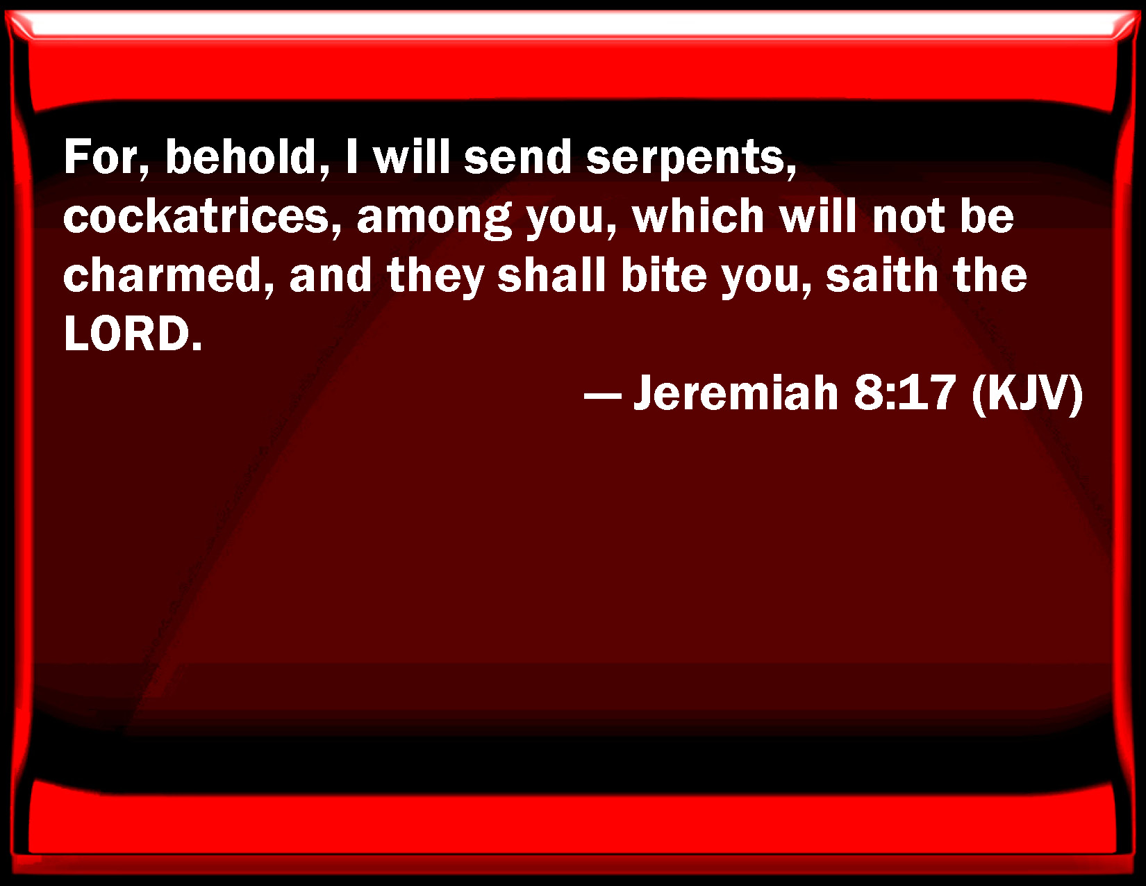 Bible Verse Slide Jeremiah 8:17 For, behold, I will send serpents, cockatrices, among you, which will not be charmed, and they shall bite you, said the LORD. KJV: For, behold, I will send serpents, cockatrices, among you, which will not be charmed, and they shall bite you, saith the LORD. DRB: For behold I will send among you serpents, basilisks, against which there is no charm: and they shall bite you, saith the Lord. DBT: For behold, I send among you serpents, vipers against which there is no charm, and they shall bite you, saith Jehovah. ERV: For, behold, I will send serpents, basilisks, among you, which will not be charmed; and they shall bite you, saith the LORD. WBT: For behold, I will send serpents, cockatrices, among you, which will not be charmed, and they shall bite you, saith the LORD. WEB: For, behold, I will send serpents, adders, among you, which will not be charmed; and they shall bite you, says Yahweh. YLT: For, lo, I am sending among you serpents, Vipers that have no charmer, And they have bitten you, an affirmation of Jehovah.Links Jeremiah 8:17 NIV • Jeremiah 8:17 NLT • Jeremiah 8:17 ESV • Jeremiah 8:17 NASB • Jeremiah 8:17 KJV • Jeremiah 8:17 Interlinear • Jeremiah 8:17 Commentaries • Jeremiah 8:17 Parallel Texts • Jeremiah 8:17 Bible Apps • Jeremiah 8:17 Parallel • Bible Hub |