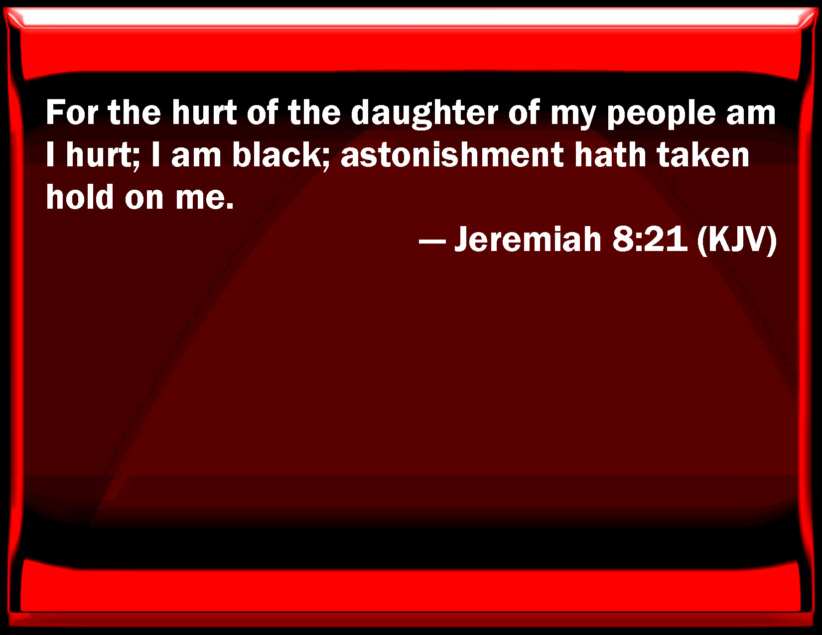For the hurt of the daughter of my people am I hurt: I am black; astonishment hath taken hold on me.