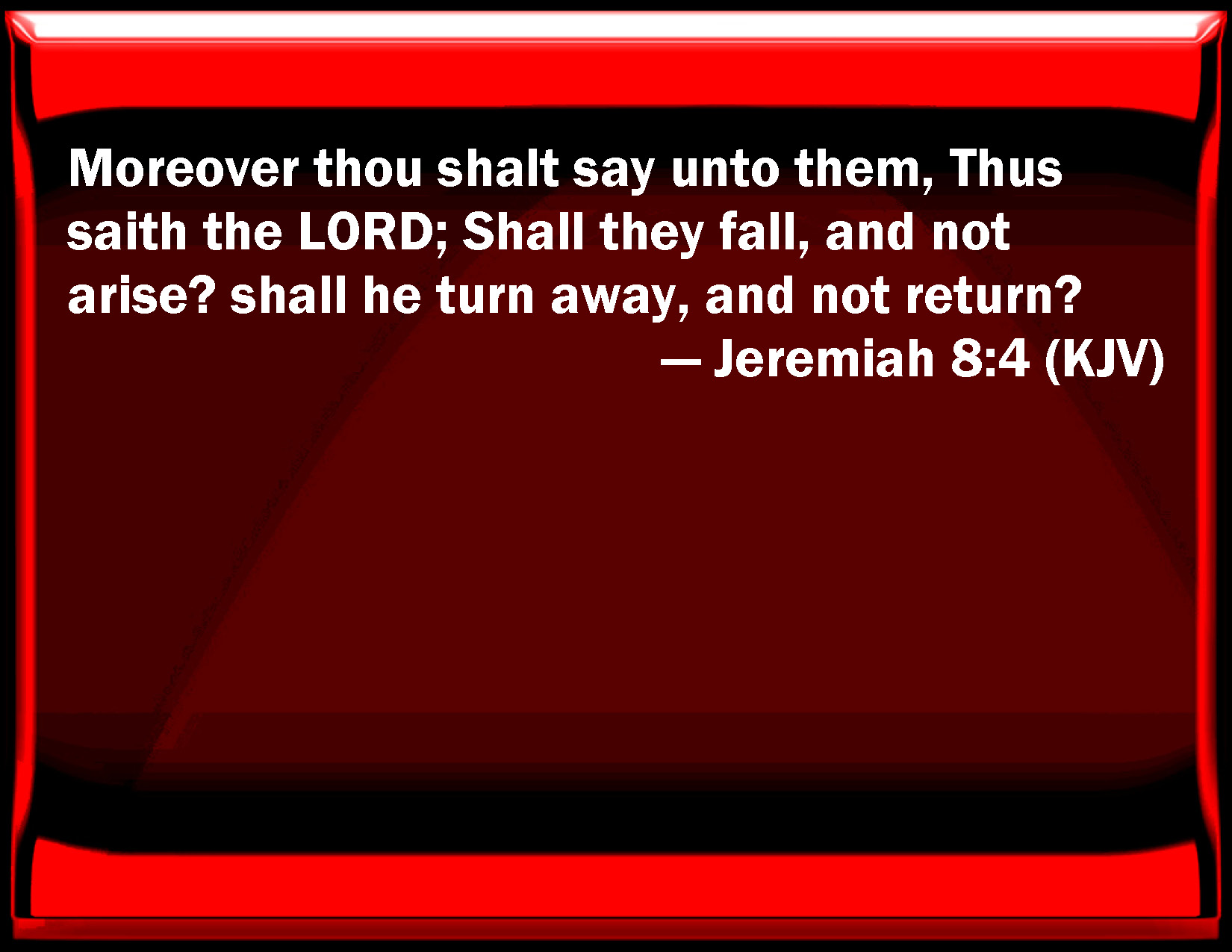 Bible Verse Slide Jeremiah 8:4 Moreover you shall say to them, Thus said the LORD; Shall they fall, and not arise? shall he turn away, and not return? KJV: Moreover thou shalt say unto them, Thus saith the LORD; Shall they fall, and not arise? shall he turn away, and not return? DRB: And thou shalt say to them: Thus saith the Lord: Shall not he that falleth, rise again? and he that is turned away, shall he not turn again? DBT: And thou shalt say unto them, Thus saith Jehovah: Do men fall, and not rise up? Doth one turn away, and not return? ERV: Moreover thou shalt say unto them, Thus saith the LORD: shall men fall, and not rise up again? shall one turn away, and not return? WBT: Moreover, thou shalt say to them, Thus saith the LORD; Shall they fall, and not arise? shall he turn away, and not return? WEB: Moreover you shall tell them, Thus says Yahweh: Shall men fall, and not rise up again? Shall one turn away, and not return? YLT: And thou hast said unto them: Thus said Jehovah, Do they fall, and not rise? Doth he turn back, and not return?Links Jeremiah 8:4 NIV • Jeremiah 8:4 NLT • Jeremiah 8:4 ESV • Jeremiah 8:4 NASB • Jeremiah 8:4 KJV • Jeremiah 8:4 Interlinear • Jeremiah 8:4 Commentaries • Jeremiah 8:4 Parallel Texts • Jeremiah 8:4 Bible Apps • Jeremiah 8:4 Parallel • Bible Hub |