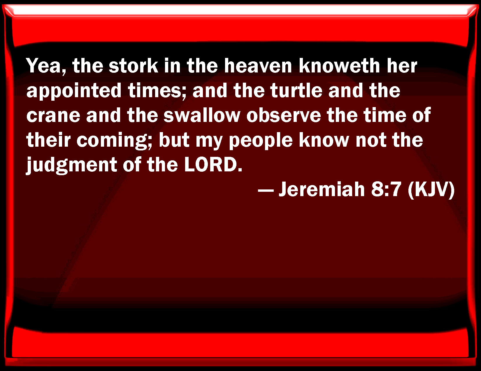 Bible Verse Slide Jeremiah 8:7 Yes, the stork in the heaven knows her appointed times; and the turtle and the crane and the swallow observe the time of their coming; but my people know not the judgment of the LORD. KJV: Yea, the stork in the heaven knoweth her appointed times; and the turtle and the crane and the swallow observe the time of their coming; but my people know not the judgment of the LORD. DRB: The kite in the air hath known her time: the turtle, and the swallow, and the stork have observed the time of their coming: but my people have not known the judgment of the Lord. DBT: Even a stork in the heavens knoweth her appointed times, and the turtle-dove and the swallow and the crane observe the time of their coming; but my people know not the judgment of Jehovah. ERV: Yea, the stork in the heaven knoweth her appointed times; and the turtle and the swallow and the crane observe the time of their coming; but my people know not the ordinance of the LORD. WBT: Yes, the stork in the heaven knoweth her appointed times; and the turtle and the crane and the swallow observe the time of their coming; but my people know not the judgment of the LORD. WEB: Yes, the stork in the sky knows her appointed times; and the turtledove and the swallow and the crane observe the time of their coming; but my people don't know Yahweh's law. YLT: Even a stork in the heavens hath known her seasons, And turtle, and swallow, and crane, Have watched the time of their coming, And — My people have not known the judgment of Jehovah.Links Jeremiah 8:7 NIV • Jeremiah 8:7 NLT • Jeremiah 8:7 ESV • Jeremiah 8:7 NASB • Jeremiah 8:7 KJV • Jeremiah 8:7 Interlinear • Jeremiah 8:7 Commentaries • Jeremiah 8:7 Parallel Texts • Jeremiah 8:7 Bible Apps • Jeremiah 8:7 Parallel • Bible Hub |