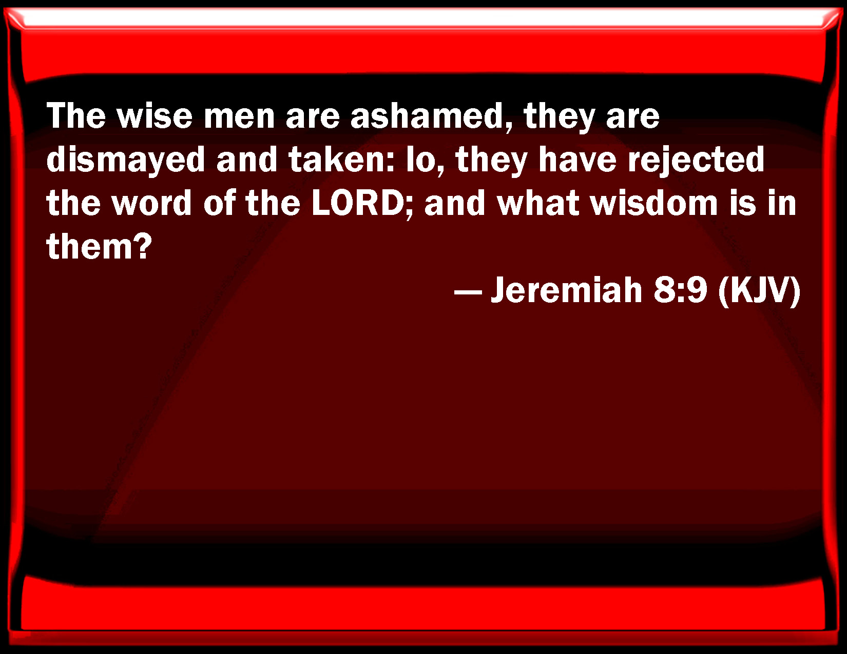 Bible Verse Slide Jeremiah 8:9 The wise men are ashamed, they are dismayed and taken: see, they have rejected the word of the LORD; and what wisdom is in them? KJV: The wise men are ashamed, they are dismayed and taken: lo, they have rejected the word of the LORD; and what wisdom is in them? DRB: The wise men are confounded, they are dismayed, and taken: for they have cast away the word of the Lord, and there is no wisdom in them. DBT: The wise men are ashamed, they are dismayed and taken: behold, they have rejected Jehovah's word; and what wisdom is in them? ERV: The wise men are ashamed, they are dismayed and taken: lo, they have rejected the word of the LORD; and what manner of wisdom is in them? WBT: The wise men are ashamed, they are dismayed and taken: lo, they have rejected the word of the LORD; and what wisdom is in them? WEB: The wise men are disappointed, they are dismayed and taken: behold, they have rejected the word of Yahweh; and what kind of wisdom is in them? YLT: Ashamed have been the wise, They have been affrighted, and are captured, Lo, against a word of Jehovah they kicked, And the wisdom of what — have they?Links Jeremiah 8:9 NIV • Jeremiah 8:9 NLT • Jeremiah 8:9 ESV • Jeremiah 8:9 NASB • Jeremiah 8:9 KJV • Jeremiah 8:9 Interlinear • Jeremiah 8:9 Commentaries • Jeremiah 8:9 Parallel Texts • Jeremiah 8:9 Bible Apps • Jeremiah 8:9 Parallel • Bible Hub |