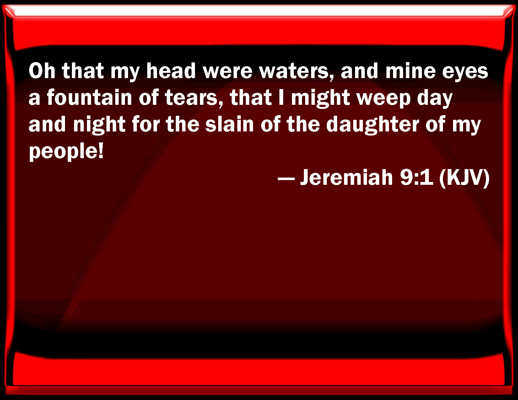 Bible Verse Slide Jeremiah 9:1 Oh that my head were waters, and my eyes a fountain of tears, that I might weep day and night for the slain of the daughter of my people! KJV: Oh that my head were waters, and mine eyes a fountain of tears, that I might weep day and night for the slain of the daughter of my people! DRB: Who will give water to my head, and a fountain of tears to my eyes? and I will weep day and night for the slain of the daughter of my people. DBT: Oh that my head were waters, and mine eye a fountain of tears, that I might weep day and night for the slain of the daughter of my people! ERV: Oh that my head were waters, and mine eyes a fountain of tears, that I might weep day and night for the slain of the daughter of my people! WBT: Oh that my head were waters, and my eyes a fountain of tears, that I might weep day and night for the slain of the daughter of my people! WEB: Oh that my head were waters, and my eyes a spring of tears, that I might weep day and night for the slain of the daughter of my people! YLT: Who doth make my head waters, And mine eye a fountain of tears? And I weep by day and by night, For the wounded of the daughter of my people.Links Jeremiah 9:1 NIV • Jeremiah 9:1 NLT • Jeremiah 9:1 ESV • Jeremiah 9:1 NASB • Jeremiah 9:1 KJV • Jeremiah 9:1 Interlinear • Jeremiah 9:1 Commentaries • Jeremiah 9:1 Parallel Texts • Jeremiah 9:1 Bible Apps • Jeremiah 9:1 Parallel • Bible Hub |