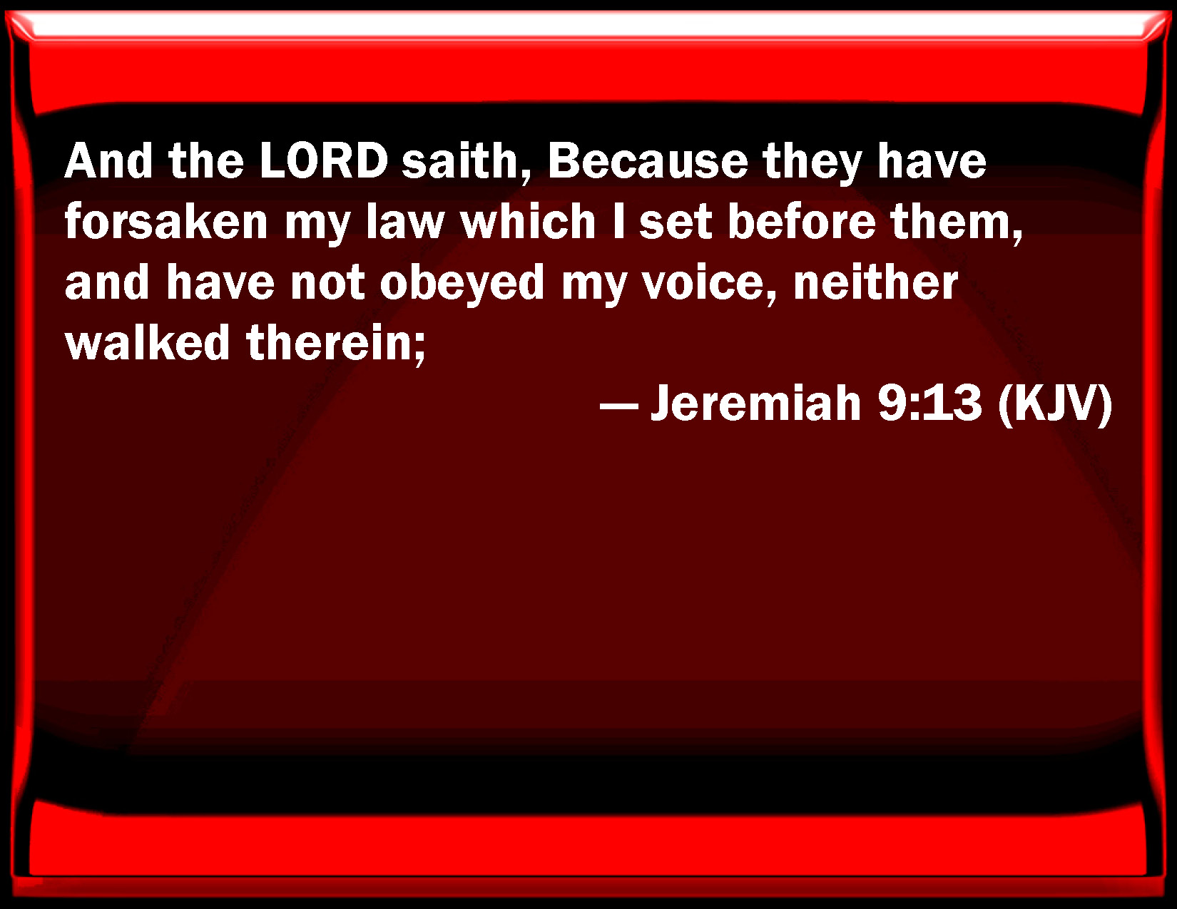 Bible Verse Slide Jeremiah 9:13 And the LORD said, Because they have forsaken my law which I set before them, and have not obeyed my voice, neither walked therein; KJV: And the LORD saith, Because they have forsaken my law which I set before them, and have not obeyed my voice, neither walked therein; DRB: And the Lord said: Because they have forsaken my law, which I gave them, and have not heard my voice, and have not walked in it. DBT: And Jehovah saith, Because they have forsaken my law which I set before them, and have not hearkened unto my voice, nor walked in it, ERV: And the LORD saith, Because they have forsaken my law which I set before them, and have not obeyed my voice, neither walked therein; WBT: And the LORD saith, Because they have forsaken my law which I set before them, and have not obeyed my voice, neither walked therein; WEB: Yahweh says, Because they have forsaken my law which I set before them, and have not obeyed my voice, neither walked therein, YLT: And Jehovah saith: Because of their forsaking My law that I set before them, And they have not hearkened to My voice nor walked in it,Links Jeremiah 9:13 NIV • Jeremiah 9:13 NLT • Jeremiah 9:13 ESV • Jeremiah 9:13 NASB • Jeremiah 9:13 KJV • Jeremiah 9:13 Interlinear • Jeremiah 9:13 Commentaries • Jeremiah 9:13 Parallel Texts • Jeremiah 9:13 Bible Apps • Jeremiah 9:13 Parallel • Bible Hub |