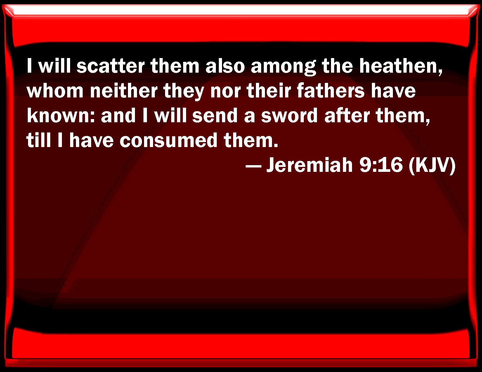Bible Verse Slide Jeremiah 9:16 I will scatter them also among the heathen, whom neither they nor their fathers have known: and I will send a sword after them, till I have consumed them. KJV: I will scatter them also among the heathen, whom neither they nor their fathers have known: and I will send a sword after them, till I have consumed them. DRB: And I will scatter them among the nations, which they and their fathers have not known: and I will send the sword after them till they be consumed. DBT: and will scatter them among the nations, whom neither they nor their fathers have known; and I will send the sword after them, till I have consumed them. ERV: I will scatter them also among the nations, whom neither they nor their fathers have known: and I will send the sword after them, till I have consumed them. WBT: I will scatter them also among the heathen, whom neither they nor their fathers have known: and I will send a sword after them, till I have consumed them. WEB: I will scatter them also among the nations, whom neither they nor their fathers have known; and I will send the sword after them, until I have consumed them. YLT: And I have scattered them among nations Which they knew not, they and their fathers, And have sent after them the sword, Till I have consumed them.Links Jeremiah 9:16 NIV • Jeremiah 9:16 NLT • Jeremiah 9:16 ESV • Jeremiah 9:16 NASB • Jeremiah 9:16 KJV • Jeremiah 9:16 Interlinear • Jeremiah 9:16 Commentaries • Jeremiah 9:16 Parallel Texts • Jeremiah 9:16 Bible Apps • Jeremiah 9:16 Parallel • Bible Hub |