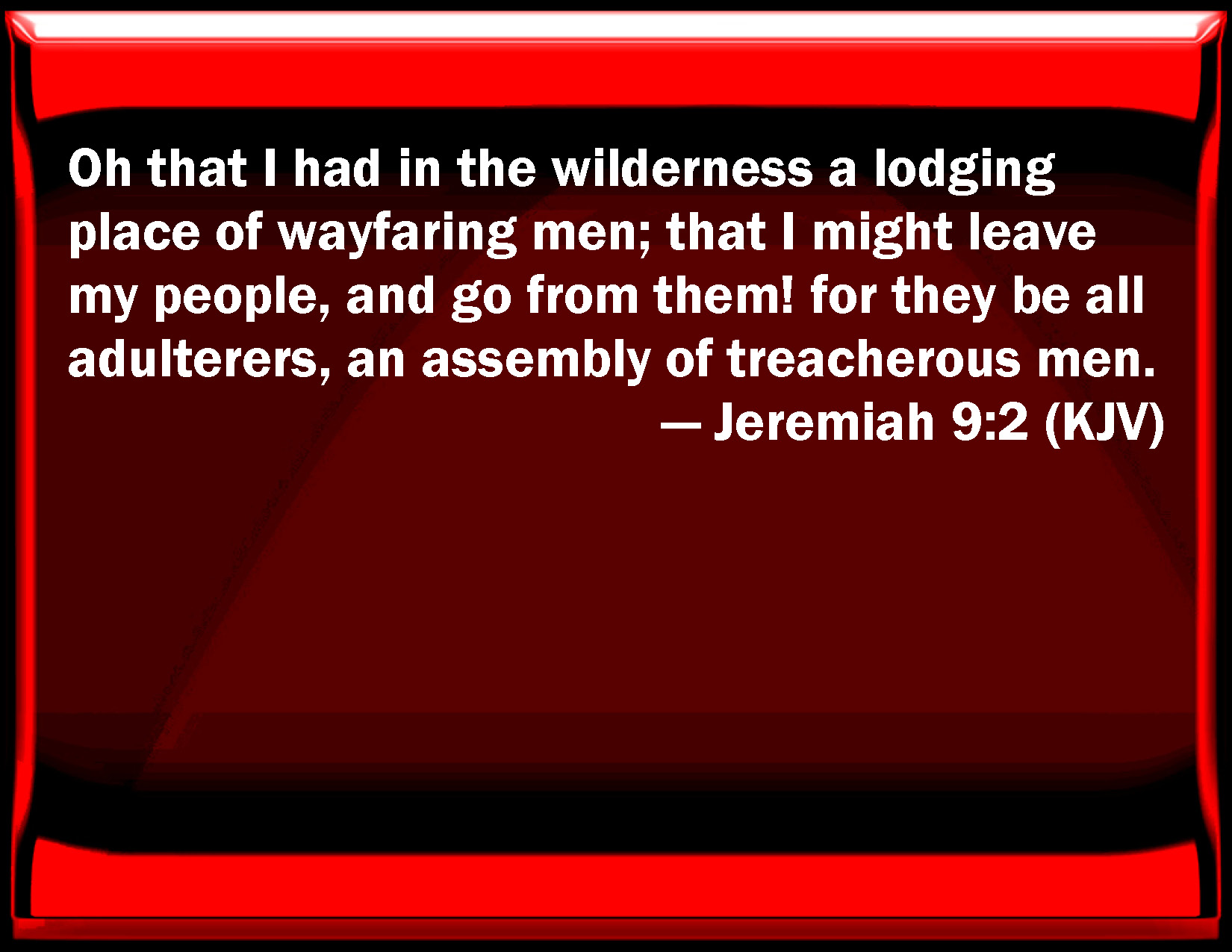 Bible Verse Slide Jeremiah 9:2 Oh that I had in the wilderness a lodging place of wayfaring men; that I might leave my people, and go from them! for they be all adulterers, an assembly of treacherous men. KJV: Oh that I had in the wilderness a lodging place of wayfaring men; that I might leave my people, and go from them! for they be all adulterers, an assembly of treacherous men. DRB: Who will give me in the wilderness a lodging place of wayfaring men, and I will leave my people, and depart from them? because they are all adulterers, an assembly of transgressors. DBT: Oh that I had in the wilderness a traveller's lodging-place, that I might leave my people, and go away from them! For they are all adulterers, an assembly of treacherous men. ERV: Oh that I had in the wilderness a lodging place of wayfaring men; that I might leave my people, and go from them! for they be all adulterers, an assembly of treacherous men. WBT: Oh that I had in the wilderness a lodging-place of way-faring men; that I might leave my people, and go from them! for they are all adulterers, an assembly of treacherous men. WEB: Oh that I had in the wilderness a lodging place of wayfaring men; that I might leave my people, and go from them! for they are all adulterers, an assembly of treacherous men. YLT: Who doth give me in a wilderness A lodging-place of travellers? And I leave my people, and go from them, For all of them are adulterers, An assembly of treacherous ones.Links Jeremiah 9:2 NIV • Jeremiah 9:2 NLT • Jeremiah 9:2 ESV • Jeremiah 9:2 NASB • Jeremiah 9:2 KJV • Jeremiah 9:2 Interlinear • Jeremiah 9:2 Commentaries • Jeremiah 9:2 Parallel Texts • Jeremiah 9:2 Bible Apps • Jeremiah 9:2 Parallel • Bible Hub |