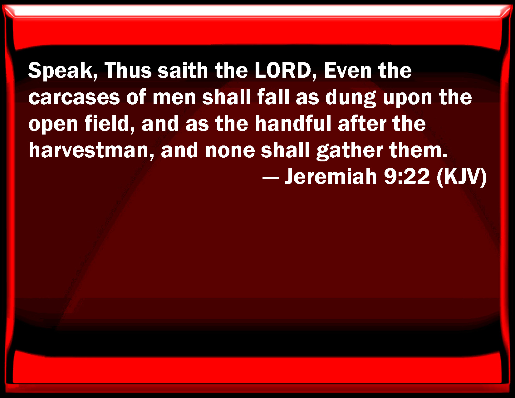 Bible Verse Slide Jeremiah 9:22 Speak, Thus said the LORD, Even the carcasses of men shall fall as dung on the open field, and as the handful after the harvestman, and none shall gather them. KJV: Speak, Thus saith the LORD, Even the carcases of men shall fall as dung upon the open field, and as the handful after the harvestman, and none shall gather them. DRB: Speak: Thus saith the Lord: Even the carcass of man shall fall as dung upon the face of the country, and as grass behind the back of the mower, and there is none to gather it. DBT: Speak, Thus saith Jehovah: Yea, the carcases of men shall fall as dung upon the open field, and as the handful after the reaper, and there shall be none to gather. ERV: Speak, Thus saith the LORD, The carcases of men shall fall as dung upon the open field, and as the handful after the harvestman, and none shall gather them. WBT: Speak, Thus saith the LORD, Even the carcasses of men shall fall as dung upon the open field, and as the handful after the harvest-man, and none shall gather them. WEB: Speak, Thus says Yahweh, The dead bodies of men shall fall as dung on the open field, and as the handful after the harvester; and none shall gather [them]. YLT: Speak thus — an affirmation of Jehovah, And fallen hath the carcase of man, As dung on the face of the field, And as a handful after the reaper, And there is none gathering.Links Jeremiah 9:22 NIV • Jeremiah 9:22 NLT • Jeremiah 9:22 ESV • Jeremiah 9:22 NASB • Jeremiah 9:22 KJV • Jeremiah 9:22 Interlinear • Jeremiah 9:22 Commentaries • Jeremiah 9:22 Parallel Texts • Jeremiah 9:22 Bible Apps • Jeremiah 9:22 Parallel • Bible Hub |