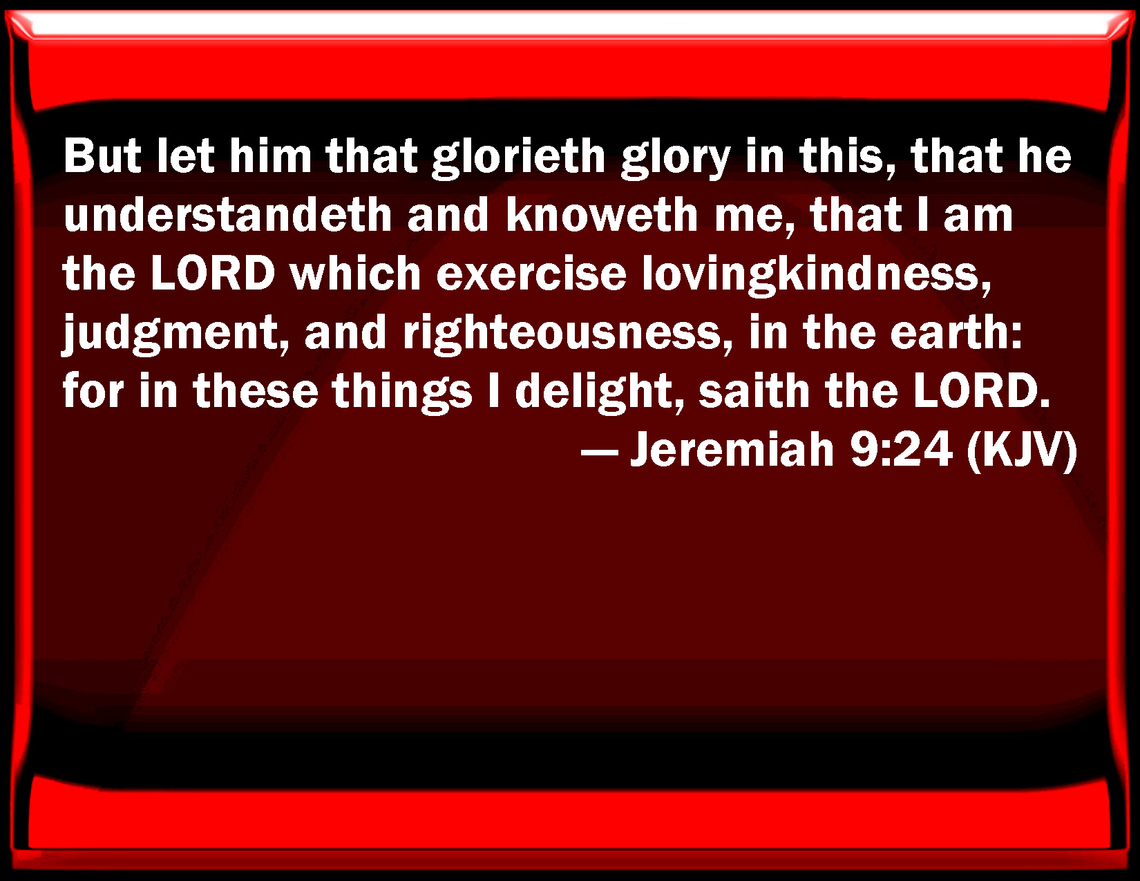 Bible Verse Slide Jeremiah 9:24 But let him that glories glory in this, that he understands and knows me, that I am the LORD which exercise loving kindness, judgment, and righteousness, in the earth: for in these things I delight, said the LORD. KJV: But let him that glorieth glory in this, that he understandeth and knoweth me, that I am the LORD which exercise lovingkindness, judgment, and righteousness, in the earth: for in these things I delight, saith the LORD. DRB: But let him that glorieth glory in this, that he understandeth and knoweth me, for I am the Lord that exercise mercy, and judgment, and justice in the earth: for these things please me, saith the Lord. DBT: but let him that glorieth glory in this, that he understandeth and knoweth me, that I am Jehovah, who exercise loving-kindness, judgment, and righteousness in the earth; for in these things I delight, saith Jehovah. ERV: but let him that glorieth glory in this, that he understandeth, and knoweth me, that I am the LORD which exercise lovingkindness, judgment, and righteousness, in the earth: for in these things I delight, saith the LORD. WBT: But let him that glorieth, glory in this, that he understandeth and knoweth me, that I am the LORD who exercise loving-kindness, judgment, and righteousness, in the earth: for in these things I delight, saith the LORD. WEB: but let him who glories glory in this, that he has understanding, and knows me, that I am Yahweh who exercises loving kindness, justice, and righteousness, in the earth: for in these things I delight, says Yahweh. YLT: But — in this let the boaster boast himself, In understanding and knowing Me, For I am Jehovah, doing kindness, Judgment, and righteousness, in the earth, For in these I have delighted, An affirmation of Jehovah.Links Jeremiah 9:24 NIV • Jeremiah 9:24 NLT • Jeremiah 9:24 ESV • Jeremiah 9:24 NASB • Jeremiah 9:24 KJV • Jeremiah 9:24 Interlinear • Jeremiah 9:24 Commentaries • Jeremiah 9:24 Parallel Texts • Jeremiah 9:24 Bible Apps • Jeremiah 9:24 Parallel • Bible Hub |