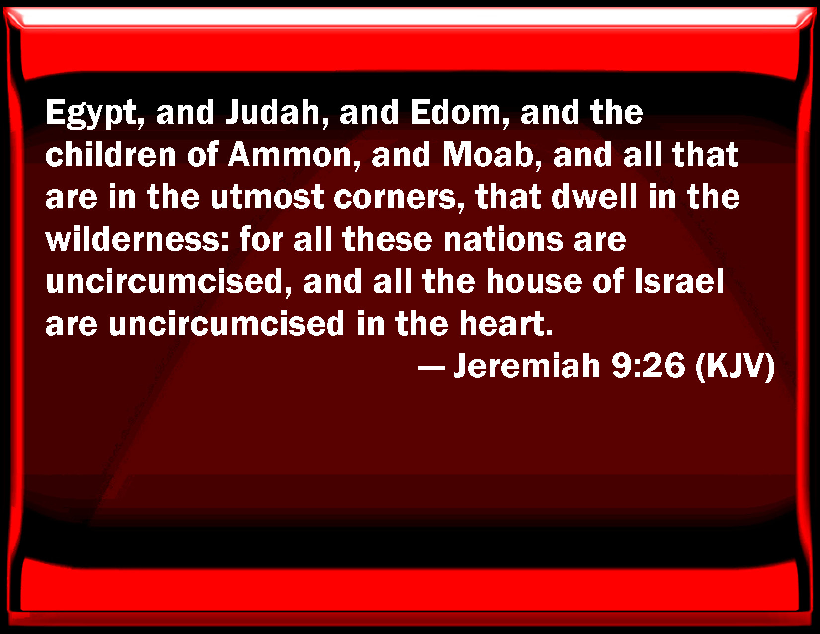 Bible Verse Slide Jeremiah 9:26 Egypt, and Judah, and Edom, and the children of Ammon, and Moab, and all that are in the utmost corners, that dwell in the wilderness: for all these nations are uncircumcised, and all the house of Israel are uncircumcised in the heart. KJV: Egypt, and Judah, and Edom, and the children of Ammon, and Moab, and all that are in the utmost corners, that dwell in the wilderness: for all these nations are uncircumcised, and all the house of Israel are uncircumcised in the heart. DRB: Upon Egypt, and upon Juda, and upon Edom, and upon the children of Ammon, and upon Moab, and upon all that have their hair polled round, that dwell in the desert: for all the nations are uncircumcised in the flesh, but all the house of Israel are uncircumcised in the heart. DBT: Egypt, and Judah, and Edom, and the children of Ammon, and Moab, and all that have the corners of their beard cut off, that dwell in the wilderness: for all the nations are uncircumcised, and all the house of Israel are uncircumcised in heart. ERV: Egypt, and Judah, and Edom, and the children of Ammon, and Moab, and all that have the corners of their hair polled, that dwell in the wilderness: for all the nations are uncircumcised, and all the house of Israel are uncircumcised in heart. WBT: Egypt, and Judah, and Edom, and the children of Ammon, and Moab, and all that are in the utmost corners, that dwell in the wilderness: for all these nations are uncircumcised, and all the house of Israel are uncircumcised in the heart. WEB: Egypt, and Judah, and Edom, and the children of Ammon, and Moab, and all that have the corners [of their hair] cut off, who dwell in the wilderness; for all the nations are uncircumcised, and all the house of Israel are uncircumcised in heart. YLT: On Egypt, and on Judah, and on Edom, And on the sons of Ammon, and on Moab, And on all cutting the corner of the beard, Who are dwelling in the wilderness, For all the nations are uncircumcised, And all the house of Israel are uncircumcised in heart!Links Jeremiah 9:26 NIV • Jeremiah 9:26 NLT • Jeremiah 9:26 ESV • Jeremiah 9:26 NASB • Jeremiah 9:26 KJV • Jeremiah 9:26 Interlinear • Jeremiah 9:26 Commentaries • Jeremiah 9:26 Parallel Texts • Jeremiah 9:26 Bible Apps • Jeremiah 9:26 Parallel • Bible Hub |