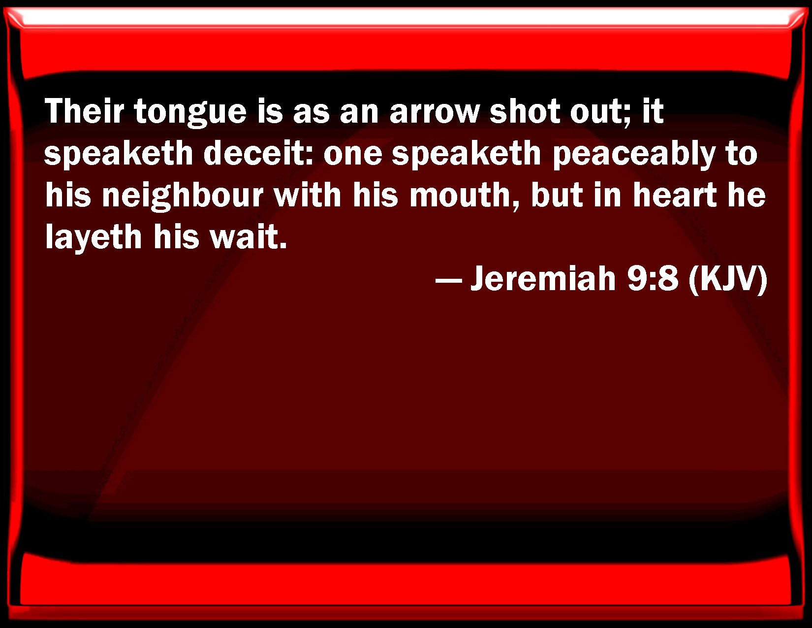 Bible Verse Slide Jeremiah 9:8 Their tongue is as an arrow shot out; it speaks deceit: one speaks peaceably to his neighbor with his mouth, but in heart he lays his wait. KJV: Their tongue is as an arrow shot out; it speaketh deceit: one speaketh peaceably to his neighbour with his mouth, but in heart he layeth his wait. DRB: Their tongue is a piercing arrow, it hath spoken deceit: with his mouth one speaketh peace with his friend, and secretly he lieth in wait for him. DBT: Their tongue is a murderous arrow; it speaketh deceit. A man speaketh peaceably to his neighbour with his mouth, but in his heart he layeth his ambush. ERV: Their tongue is a deadly arrow; it speaketh deceit: one speaketh peaceably to his neighbour with his mouth, but in his heart he layeth wait for him. WBT: Their tongue is as an arrow shot out; it speaketh deceit: one speaketh peaceably to his neighbor with his mouth, but in heart he layeth his wait. WEB: Their tongue is a deadly arrow; it speaks deceit: one speaks peaceably to his neighbor with his mouth, but in his heart he lays wait for him. YLT: A slaughtering arrow is their tongue, Deceit it hath spoken in its mouth, Peace with its neighbour it speaketh, And in its heart it layeth its ambush,Links Jeremiah 9:8 NIV • Jeremiah 9:8 NLT • Jeremiah 9:8 ESV • Jeremiah 9:8 NASB • Jeremiah 9:8 KJV • Jeremiah 9:8 Interlinear • Jeremiah 9:8 Commentaries • Jeremiah 9:8 Parallel Texts • Jeremiah 9:8 Bible Apps • Jeremiah 9:8 Parallel • Bible Hub |