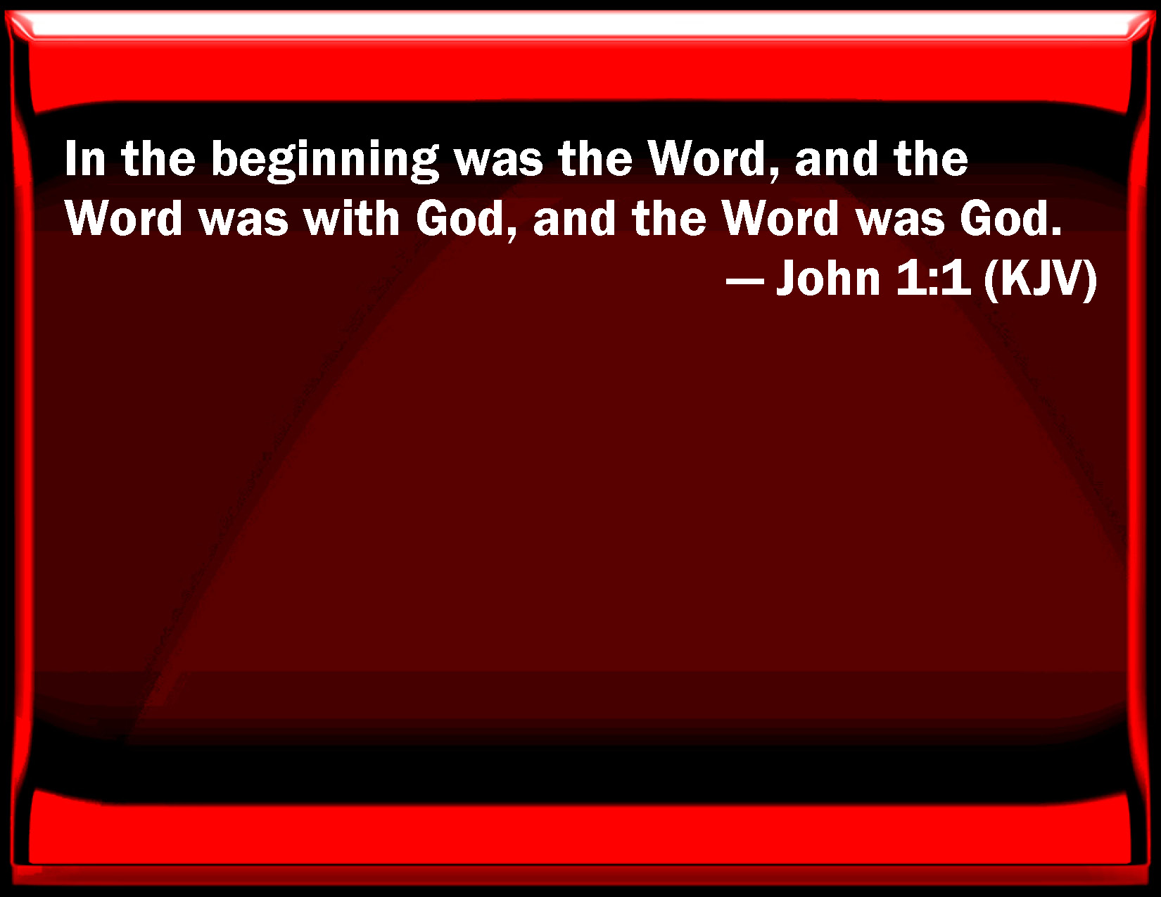 Bible Verse Slide John 1:1 In the beginning was the Word, and the Word was with God, and the Word was God. KJV: In the beginning was the Word, and the Word was with God, and the Word was God. DRB: IN the beginning was the Word, and the Word was with God, and the Word was God. DBT: In the beginning was the Word, and the Word was with God, and the Word was God. ERV: In the beginning was the Word, and the Word was with God, and the Word was God. WBT: In the beginning was the Word, and the Word was with God, and the Word was God. WEB: In the beginning was the Word, and the Word was with God, and the Word was God. YLT: In the beginning was the Word, and the Word was with God, and the Word was God;Links John 1:1 NIV • John 1:1 NLT • John 1:1 ESV • John 1:1 NASB • John 1:1 KJV • John 1:1 Interlinear • John 1:1 Commentaries • John 1:1 Parallel Texts • John 1:1 Bible Apps • John 1:1 Parallel • Bible Hub |