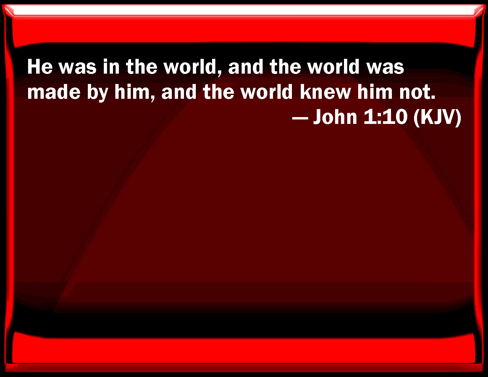 Bible Verse Slide John 1:10 He was in the world, and the world was made by him, and the world knew him not. KJV: He was in the world, and the world was made by him, and the world knew him not. DRB: He was in the world, and the world was made by him, and the world knew him not. DBT: He was in the world, and the world had its being through him, and the world knew him not. ERV: He was in the world, and the world was made by him, and the world knew him not. WBT: He was in the world, and the world was made by him, and the world knew him not. WEB: He was in the world, and the world was made through him, and the world didn't recognize him. YLT: in the world he was, and the world through him was made, and the world did not know him:Links John 1:10 NIV • John 1:10 NLT • John 1:10 ESV • John 1:10 NASB • John 1:10 KJV • John 1:10 Interlinear • John 1:10 Commentaries • John 1:10 Parallel Texts • John 1:10 Bible Apps • John 1:10 Parallel • Bible Hub |