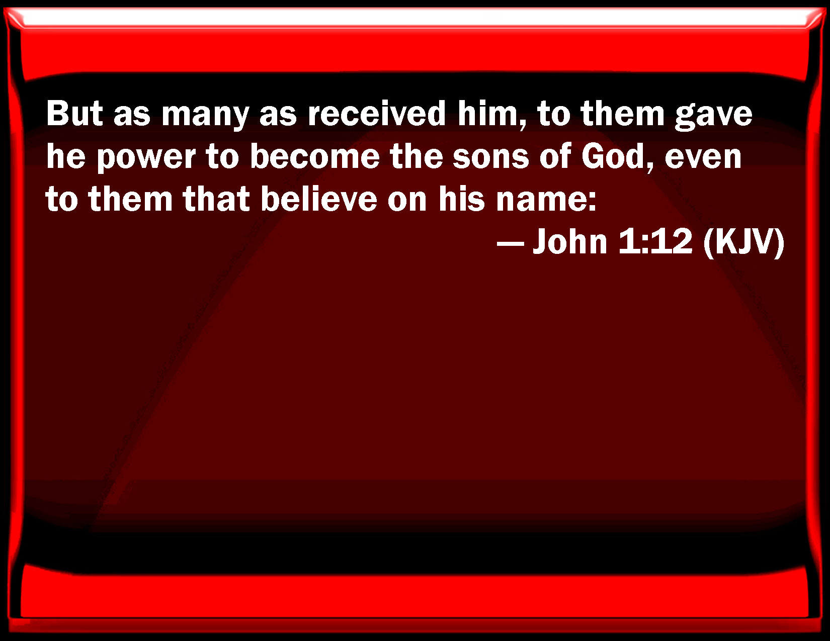 Bible Verse Slide John 1:12 But as many as received him, to them gave he power to become the sons of God, even to them that believe on his name: KJV: But as many as received him, to them gave he power to become the sons of God, even to them that believe on his name: DRB: But as many as received him, he gave them power to be made the sons of God, to them that believe in his name. DBT: but as many as received him, to them gave he the right to be children of God, to those that believe on his name; ERV: But as many as received him, to them gave he the right to become children of God, even to them that believe on his name: WBT: But as many as received him, to them he gave power to become the sons of God, even to them that believe on his name: WEB: But as many as received him, to them he gave the right to become God's children, to those who believe in his name: YLT: but as many as did receive him to them he gave authority to become sons of God — to those believing in his name,Links John 1:12 NIV • John 1:12 NLT • John 1:12 ESV • John 1:12 NASB • John 1:12 KJV • John 1:12 Interlinear • John 1:12 Commentaries • John 1:12 Parallel Texts • John 1:12 Bible Apps • John 1:12 Parallel • Bible Hub |