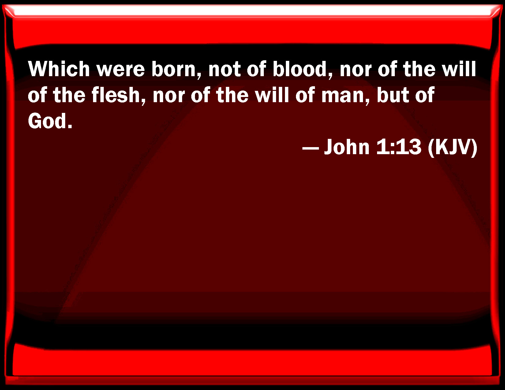 Bible Verse Slide John 1:13 Which were born, not of blood, nor of the will of the flesh, nor of the will of man, but of God. KJV: Which were born, not of blood, nor of the will of the flesh, nor of the will of man, but of God. DRB: Who are born, not of blood, nor of the will of the flesh, nor of the will of man, but of God. DBT: who have been born, not of blood, nor of flesh's will, nor of man's will, but of God. ERV: which were born, not of blood, nor of the will of the flesh, nor of the will of man, but of God. WBT: Who were born, not of blood, nor of the will of the flesh, nor of the will of man, but of God. WEB: who were born not of blood, nor of the will of the flesh, nor of the will of man, but of God. YLT: who — not of blood nor of a will of flesh, nor of a will of man but — of God were begotten.Links John 1:13 NIV • John 1:13 NLT • John 1:13 ESV • John 1:13 NASB • John 1:13 KJV • John 1:13 Interlinear • John 1:13 Commentaries • John 1:13 Parallel Texts • John 1:13 Bible Apps • John 1:13 Parallel • Bible Hub |