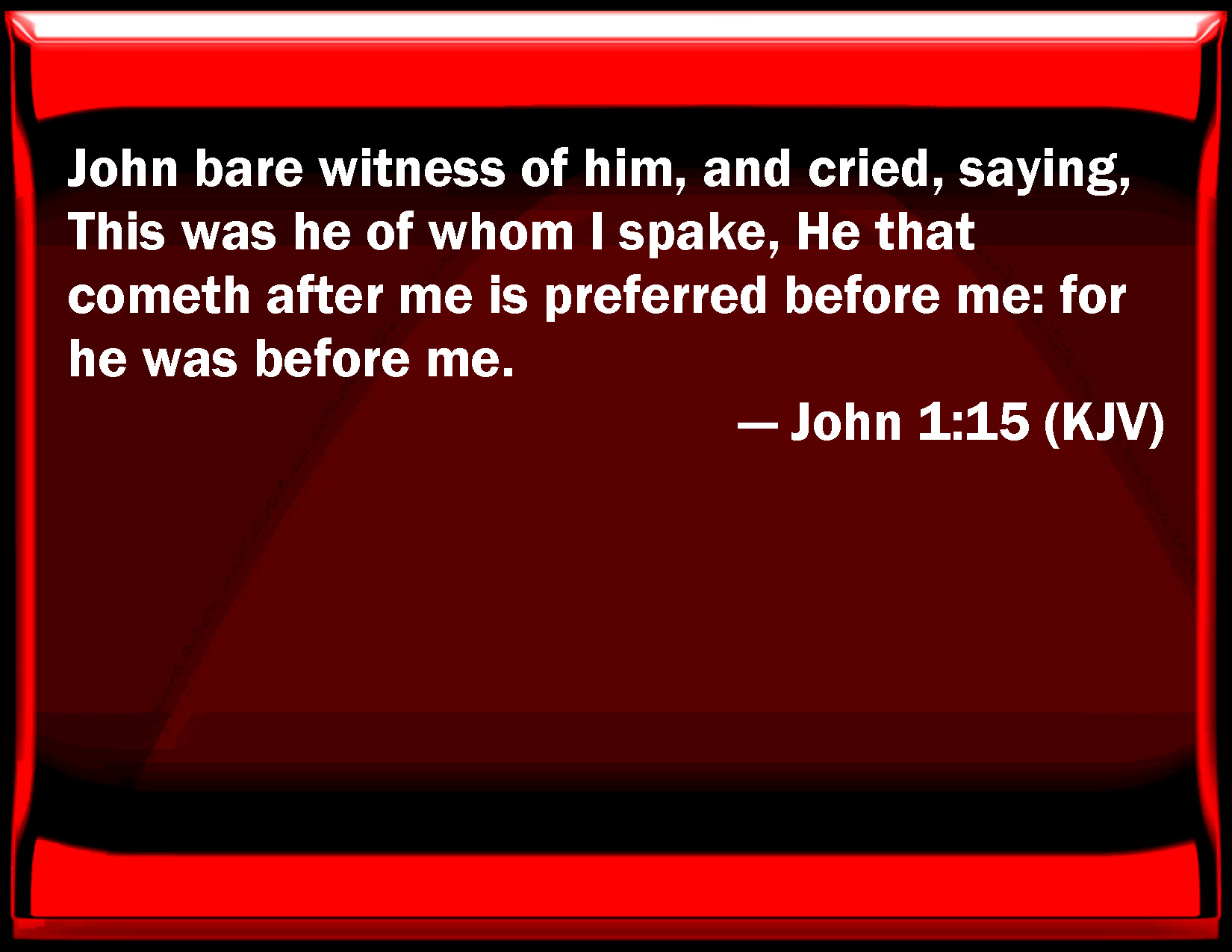 Bible Verse Slide John 1:15 John bore witness of him, and cried, saying, This was he of whom I spoke, He that comes after me is preferred before me: for he was before me. KJV: John bare witness of him, and cried, saying, This was he of whom I spake, He that cometh after me is preferred before me: for he was before me. DRB: John beareth witness of him, and crieth out, saying: This was he of whom I spoke: He that shall come after me, is preferred before me: because he was before me. DBT: (John bears witness of him, and he has cried, saying, This was he of whom I said, He that comes after me is preferred before me, for he was before me;) ERV: John beareth witness of him, and crieth, saying, This was he of whom I said, He that cometh after me is become before me: for he was before me. WBT: John testified concerning him, and cried, saying, This was he of whom I spoke, He that cometh after me, is preferred before me; for he was before me. WEB: John testified about him. He cried out, saying, "This was he of whom I said, 'He who comes after me has surpassed me, for he was before me.'" YLT: John doth testify concerning him, and hath cried, saying, 'This was he of whom I said, He who after me is coming, hath come before me, for he was before me;'Links John 1:15 NIV • John 1:15 NLT • John 1:15 ESV • John 1:15 NASB • John 1:15 KJV • John 1:15 Interlinear • John 1:15 Commentaries • John 1:15 Parallel Texts • John 1:15 Bible Apps • John 1:15 Parallel • Bible Hub |
