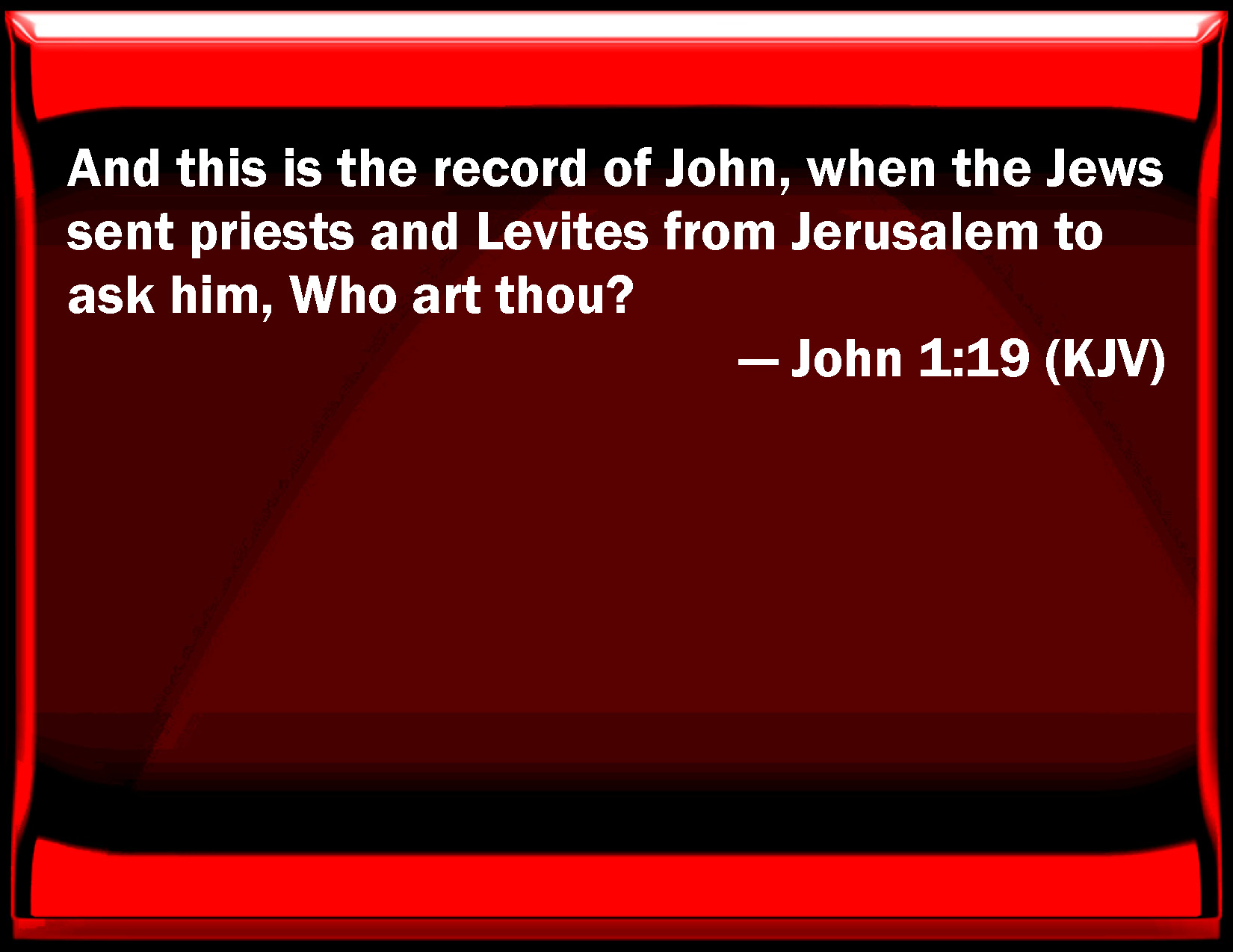 Bible Verse Slide John 1:19 And this is the record of John, when the Jews sent priests and Levites from Jerusalem to ask him, Who are you? KJV: And this is the record of John, when the Jews sent priests and Levites from Jerusalem to ask him, Who art thou? DRB: And this is the testimony of John, when the Jews sent from Jerusalem priests and Levites to him, to ask him: Who art thou? DBT: And this is the witness of John, when the Jews sent from Jerusalem priests and Levites that they might ask him, Thou, who art thou? ERV: And this is the witness of John, when the Jews sent unto him from Jerusalem priests and Levites to ask him, Who art thou? WBT: And this is the testimony of John, when the Jews sent priests and Levites from Jerusalem, to ask him, Who art thou? WEB: This is John's testimony, when the Jews sent priests and Levites from Jerusalem to ask him, "Who are you?" YLT: And this is the testimony of John, when the Jews sent out of Jerusalem priests and Levites, that they might question him, 'Who art thou?'Links John 1:19 NIV • John 1:19 NLT • John 1:19 ESV • John 1:19 NASB • John 1:19 KJV • John 1:19 Interlinear • John 1:19 Commentaries • John 1:19 Parallel Texts • John 1:19 Bible Apps • John 1:19 Parallel • Bible Hub |