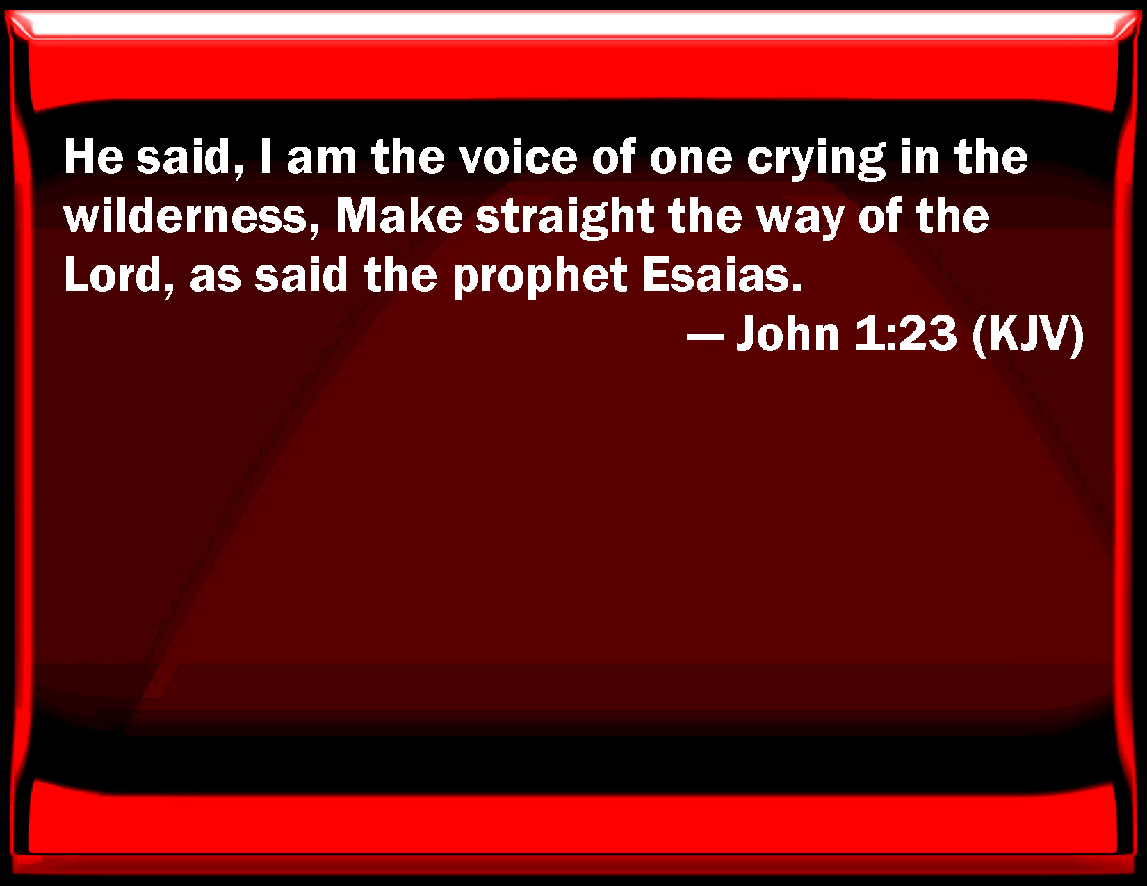 Bible Verse Slide John 1:23 He said, I am the voice of one crying in the wilderness, Make straight the way of the Lord, as said the prophet Esaias. KJV: He said, I am the voice of one crying in the wilderness, Make straight the way of the Lord, as said the prophet Esaias. DRB: He said: I am the voice of one crying out in the wilderness, make straight the way of the Lord, as said the prophet Isaias. DBT: He said, I am the voice of one crying in the wilderness, Make straight the path of the Lord, as said Esaias the prophet. ERV: He said, I am the voice of one crying in the wilderness, Make straight the way of the Lord, as said Isaiah the prophet. WBT: He said, I am the voice of one crying in the wilderness, Make straight the way of the Lord, as said the prophet Isaiah. WEB: He said, "I am the voice of one crying in the wilderness, 'Make straight the way of the Lord,' as Isaiah the prophet said." YLT: He said, 'I am a voice of one crying in the wilderness: Make straight the way of the Lord, as said Isaiah the prophet.'Links John 1:23 NIV • John 1:23 NLT • John 1:23 ESV • John 1:23 NASB • John 1:23 KJV • John 1:23 Interlinear • John 1:23 Commentaries • John 1:23 Parallel Texts • John 1:23 Bible Apps • John 1:23 Parallel • Bible Hub |