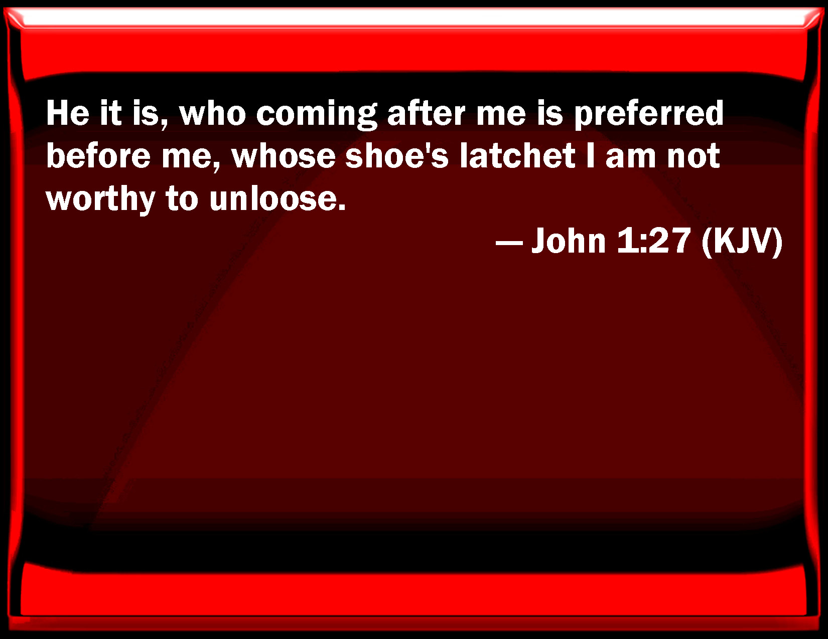 Bible Verse Slide John 1:27 He it is, who coming after me is preferred before me, whose shoe's lace I am not worthy to unloose. KJV: He it is, who coming after me is preferred before me, whose shoe's latchet I am not worthy to unloose. DRB: The same is he that shall come after me, who is preferred before me: the latchet of whose shoe I am not worthy to loose. DBT: he who comes after me, the thong of whose sandal I am not worthy to unloose. ERV: even he that cometh after me, the latchet of whose shoe I am not worthy to unloose. WBT: He it is, who coming after me, is preferred before me, whose shoes' latchet I am not worthy to unloose. WEB: He is the one who comes after me, who is preferred before me, whose sandal strap I'm not worthy to loosen." YLT: of whom I am not worthy that I may loose the cord of his sandal.'Links John 1:27 NIV • John 1:27 NLT • John 1:27 ESV • John 1:27 NASB • John 1:27 KJV • John 1:27 Interlinear • John 1:27 Commentaries • John 1:27 Parallel Texts • John 1:27 Bible Apps • John 1:27 Parallel • Bible Hub |