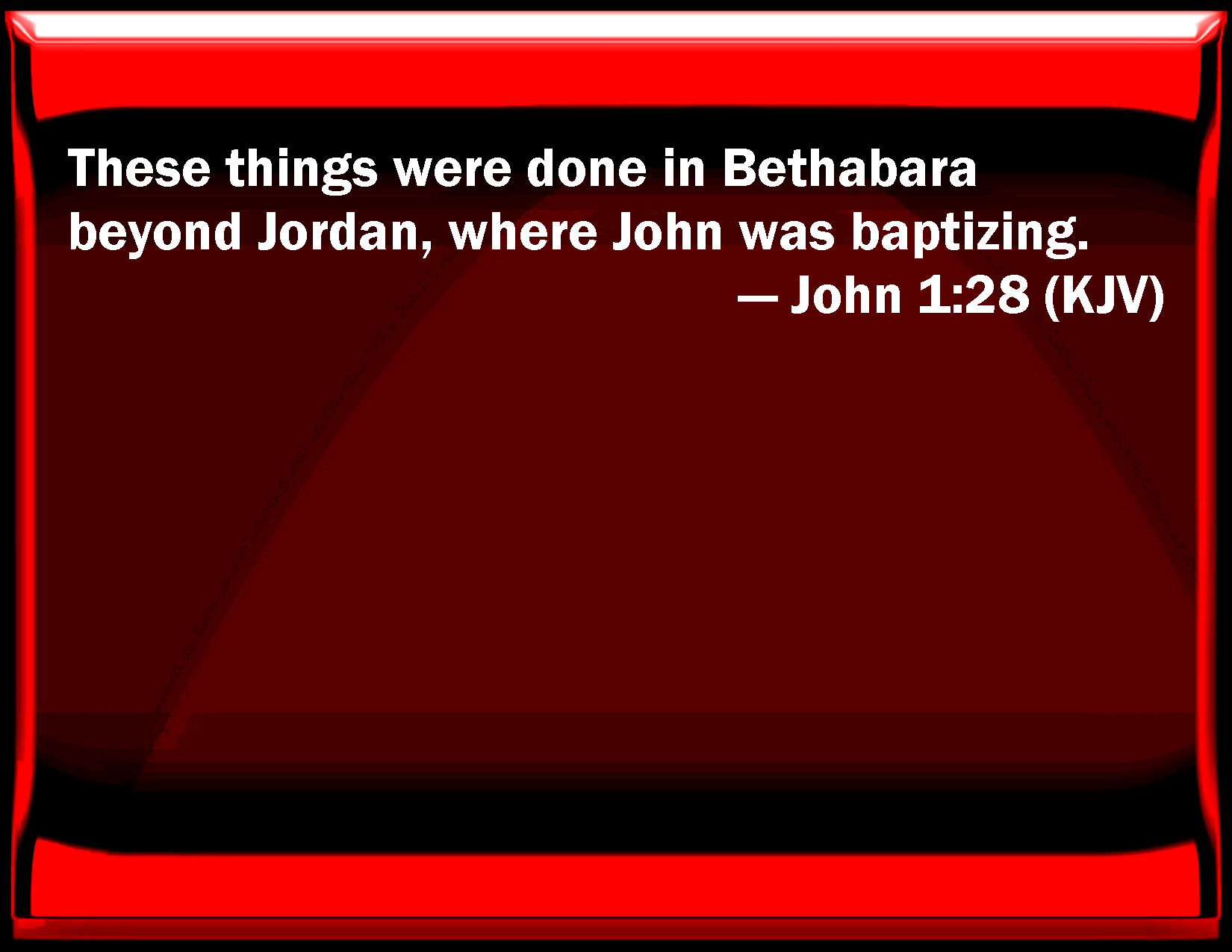 Bible Verse Slide John 1:28 These things were done in Bethabara beyond Jordan, where John was baptizing. KJV: These things were done in Bethabara beyond Jordan, where John was baptizing. DRB: These things were done in Bethania, beyond the Jordan, where John was baptizing. DBT: These things took place in Bethany, across the Jordan, where John was baptising. ERV: These things were done in Bethany beyond Jordan, where John was baptizing. WBT: These things were done in Bethabara beyond Jordan, where John was baptizing. WEB: These things were done in Bethany beyond the Jordan, where John was baptizing. YLT: These things came to pass in Bethabara, beyond the Jordan, where John was baptizing,Links John 1:28 NIV • John 1:28 NLT • John 1:28 ESV • John 1:28 NASB • John 1:28 KJV • John 1:28 Interlinear • John 1:28 Commentaries • John 1:28 Parallel Texts • John 1:28 Bible Apps • John 1:28 Parallel • Bible Hub |