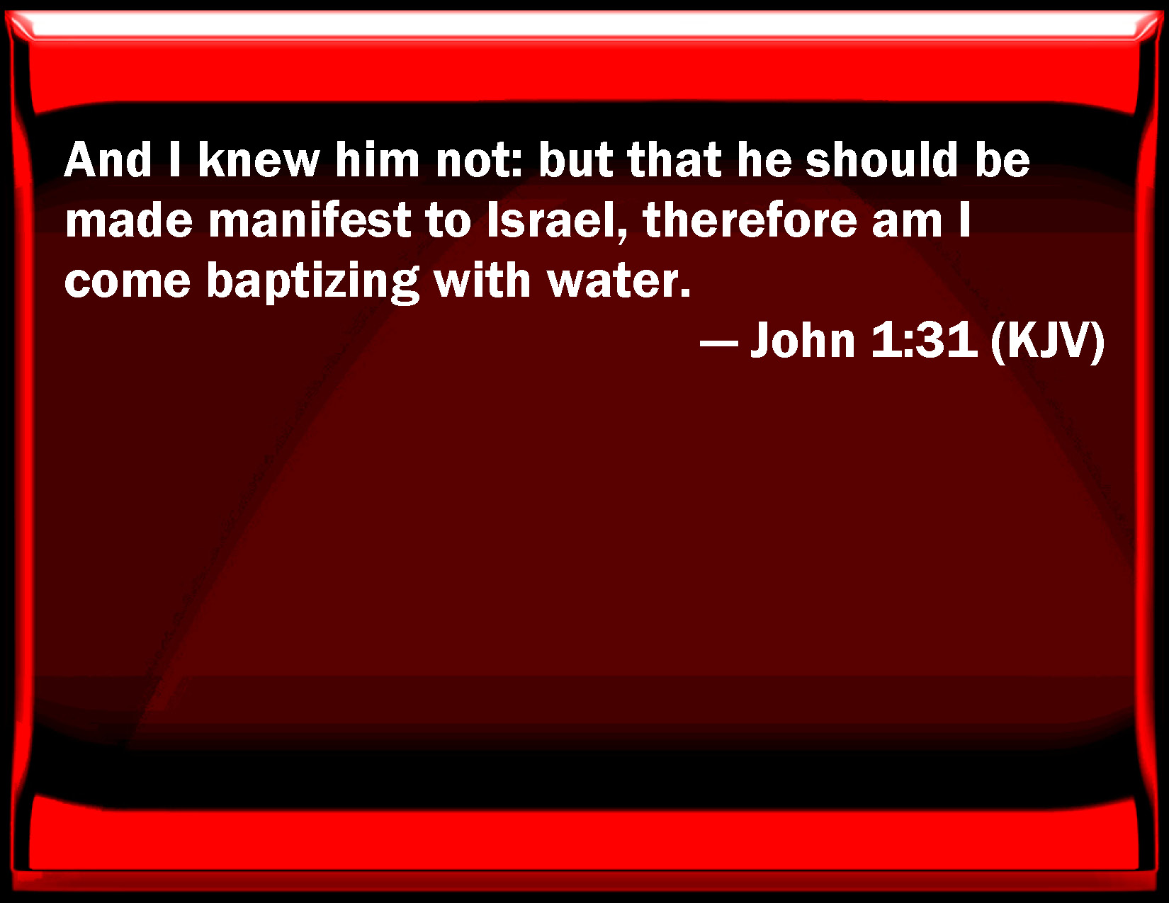 Bible Verse Slide John 1:31 And I knew him not: but that he should be made manifest to Israel, therefore am I come baptizing with water. KJV: And I knew him not: but that he should be made manifest to Israel, therefore am I come baptizing with water. DRB: And I knew him not, but that he may be made manifest in Israel, therefore am I come baptizing with water. DBT: and I knew him not; but that he might be manifested to Israel, therefore have I come baptising with water. ERV: And I knew him not; but that he should be made manifest to Israel, for this cause came I baptizing with water. WBT: And I knew him not: but that he should be made manifest to Israel, therefore am I come baptizing with water. WEB: I didn't know him, but for this reason I came baptizing in water: that he would be revealed to Israel." YLT: and I knew him not, but, that he might be manifested to Israel, because of this I came with the water baptizing.Links John 1:31 NIV • John 1:31 NLT • John 1:31 ESV • John 1:31 NASB • John 1:31 KJV • John 1:31 Interlinear • John 1:31 Commentaries • John 1:31 Parallel Texts • John 1:31 Bible Apps • John 1:31 Parallel • Bible Hub |