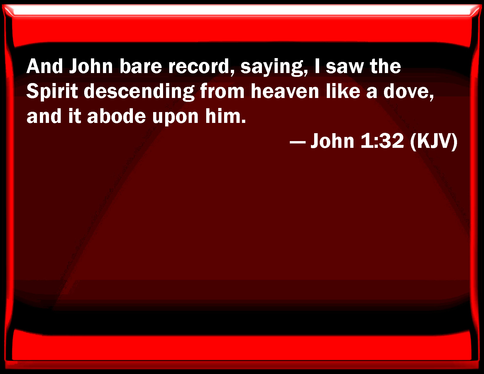 Bible Verse Slide John 1:32 And John bore record, saying, I saw the Spirit descending from heaven like a dove, and it stayed on him. KJV: And John bare record, saying, I saw the Spirit descending from heaven like a dove, and it abode upon him. DRB: And John gave testimony, saying: I saw the Spirit coming down, as a dove from heaven, and he remained upon him. DBT: And John bore witness, saying, I beheld the Spirit descending as a dove from heaven, and it abode upon him. ERV: And John bare witness, saying, I have beheld the Spirit descending as a dove out of heaven; and it abode upon him. WBT: And John bore testimony, saying, I saw the Spirit descending from heaven like a dove, and it abode upon him. WEB: John testified, saying, "I have seen the Spirit descending like a dove out of heaven, and it remained on him. YLT: And John testified, saying — 'I have seen the Spirit coming down, as a dove, out of heaven, and it remained on him;Links John 1:32 NIV • John 1:32 NLT • John 1:32 ESV • John 1:32 NASB • John 1:32 KJV • John 1:32 Interlinear • John 1:32 Commentaries • John 1:32 Parallel Texts • John 1:32 Bible Apps • John 1:32 Parallel • Bible Hub |