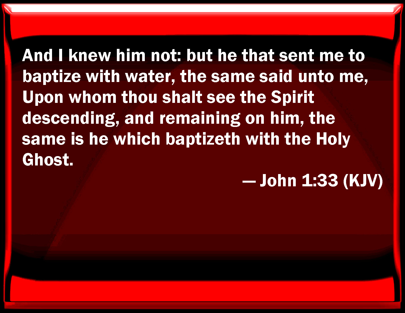 Bible Verse Slide John 1:33 And I knew him not: but he that sent me to baptize with water, the same said to me, On whom you shall see the Spirit descending, and remaining on him, the same is he which baptizes with the Holy Ghost. KJV: And I knew him not: but he that sent me to baptize with water, the same said unto me, Upon whom thou shalt see the Spirit descending, and remaining on him, the same is he which baptizeth with the Holy Ghost. DRB: And I knew him not; but he who sent me to baptize with water, said to me: He upon whom thou shalt see the Spirit descending, and remaining upon him, he it is that baptizeth with the Holy Ghost. DBT: And I knew him not; but he who sent me to baptise with water, he said to me, Upon whom thou shalt see the Spirit descending and abiding on him, he it is who baptises with the Holy Spirit. ERV: And I knew him not: but he that sent me to baptize with water, he said unto me, Upon whomsoever thou shalt see the Spirit descending, and abiding upon him, the same is he that baptizeth with the Holy Spirit. WBT: And I knew him not: but he that sent me to baptize with water, the same said to me, Upon whom thou shalt see the Spirit descending and remaining on him, the same is he who baptizeth with the Holy Spirit. WEB: I didn't recognize him, but he who sent me to baptize in water, he said to me, 'On whomever you will see the Spirit descending, and remaining on him, the same is he who baptizes in the Holy Spirit.' YLT: and I did not know him, but he who sent me to baptize with water, He said to me, On whomsoever thou mayest see the Spirit coming down, and remaining on him, this is he who is baptizing with the Holy Spirit;Links John 1:33 NIV • John 1:33 NLT • John 1:33 ESV • John 1:33 NASB • John 1:33 KJV • John 1:33 Interlinear • John 1:33 Commentaries • John 1:33 Parallel Texts • John 1:33 Bible Apps • John 1:33 Parallel • Bible Hub |