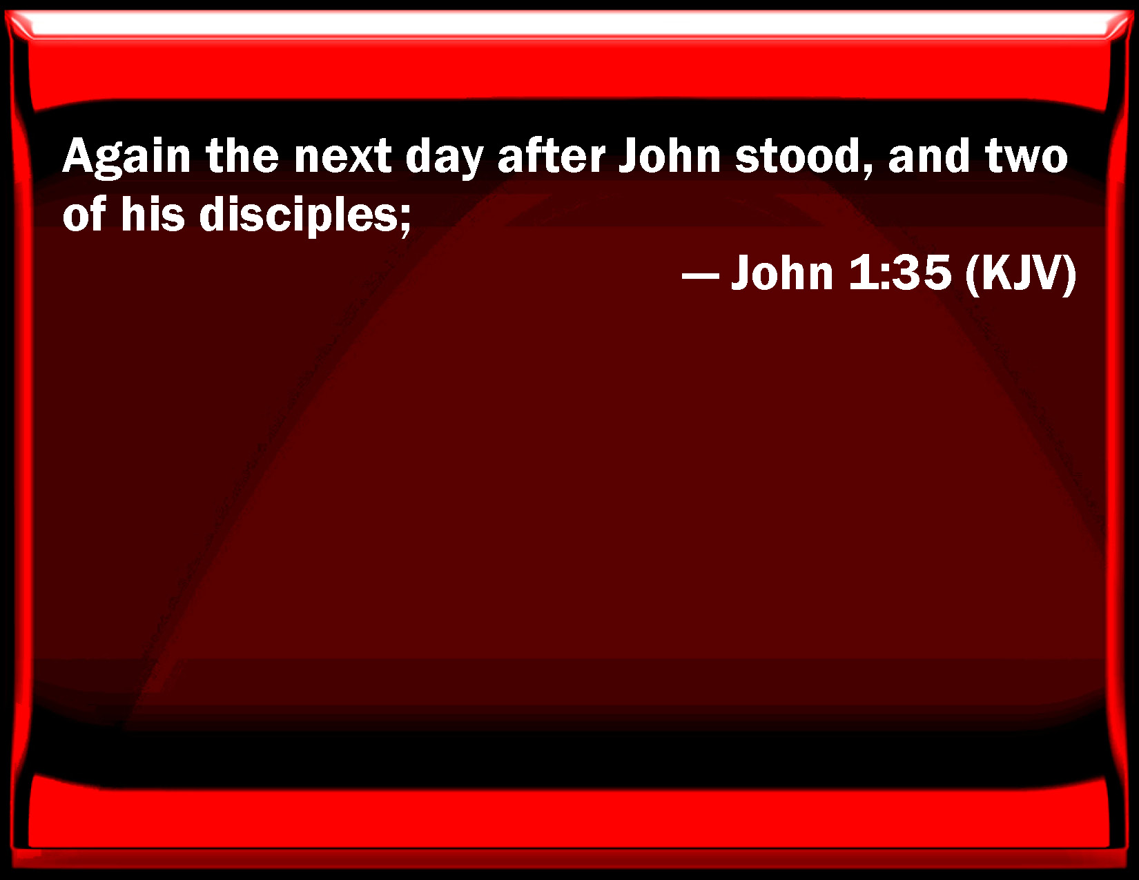 Bible Verse Slide John 1:35 Again the next day after John stood, and two of his disciples; KJV: Again the next day after John stood, and two of his disciples; DRB: The next day again John stood, and two of his disciples. DBT: Again, on the morrow, there stood John and two of his disciples. ERV: Again on the morrow John was standing, and two of his disciples; WBT: Again the next day after, John stood, and two of his disciples; WEB: Again, the next day, John was standing with two of his disciples, YLT: On the morrow, again, John was standing, and two of his disciples,Links John 1:35 NIV • John 1:35 NLT • John 1:35 ESV • John 1:35 NASB • John 1:35 KJV • John 1:35 Interlinear • John 1:35 Commentaries • John 1:35 Parallel Texts • John 1:35 Bible Apps • John 1:35 Parallel • Bible Hub |