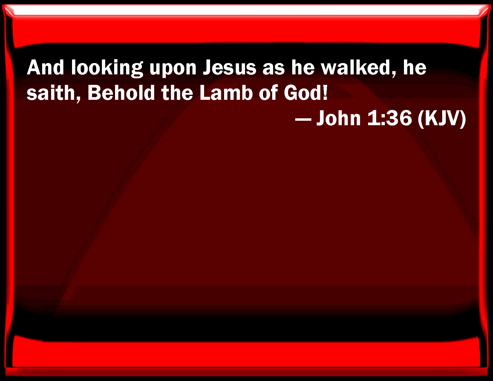 Bible Verse Slide John 1:36 And looking on Jesus as he walked, he said, Behold the Lamb of God! KJV: And looking upon Jesus as he walked, he saith, Behold the Lamb of God! DRB: And beholding Jesus walking, he saith: Behold the Lamb of God. DBT: And, looking at Jesus as he walked, he says, Behold the Lamb of God. ERV: and he looked upon Jesus as he walked, and saith, Behold, the Lamb of God! WBT: And looking upon Jesus as he walked, he saith, Behold the Lamb of God! WEB: and he looked at Jesus as he walked, and said, "Behold, the Lamb of God!" YLT: and having looked on Jesus walking, he saith, 'Lo, the Lamb of God;'Links John 1:36 NIV • John 1:36 NLT • John 1:36 ESV • John 1:36 NASB • John 1:36 KJV • John 1:36 Interlinear • John 1:36 Commentaries • John 1:36 Parallel Texts • John 1:36 Bible Apps • John 1:36 Parallel • Bible Hub |