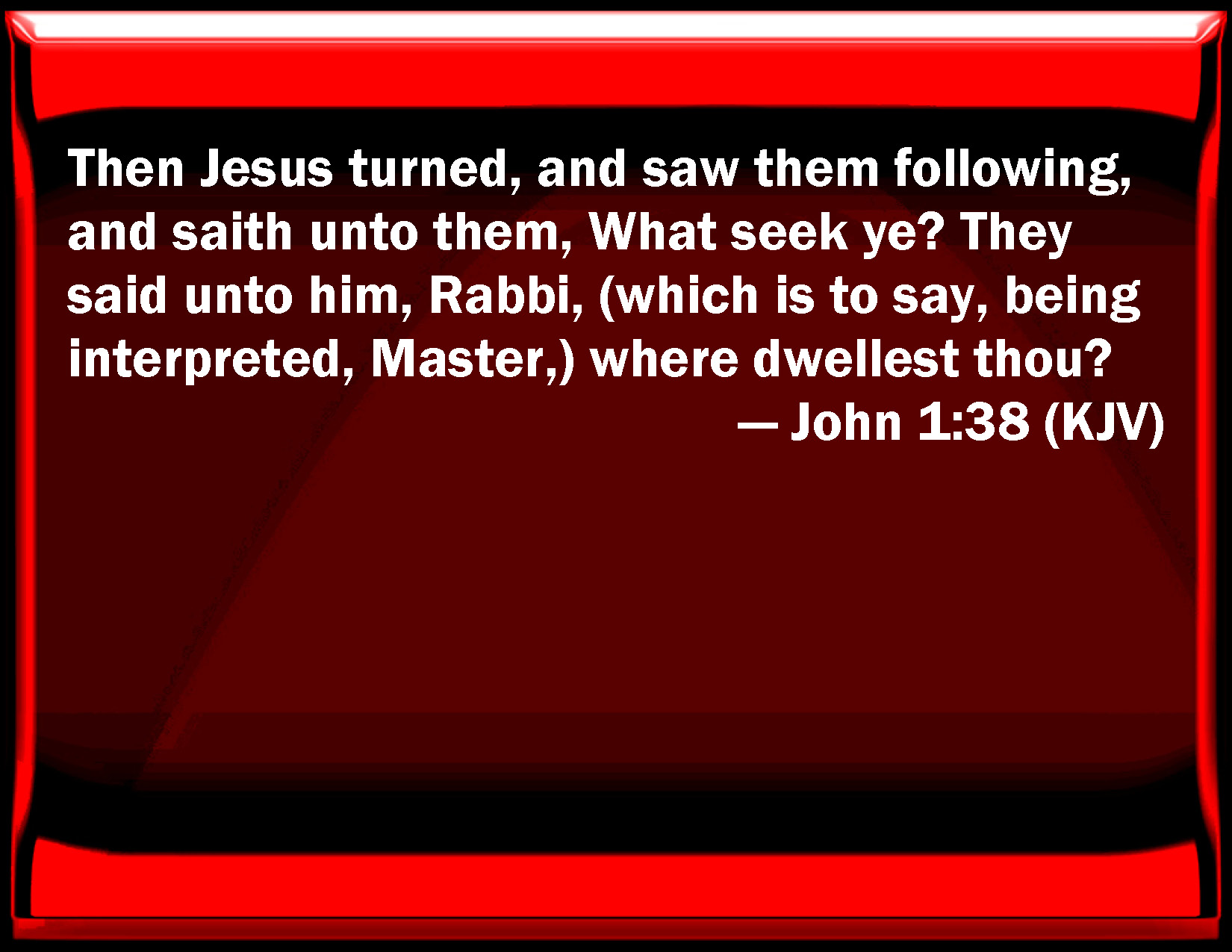 Bible Verse Slide John 1:38 Then Jesus turned, and saw them following, and said to them, What seek you? They said to him, Rabbi, (which is to say, being interpreted, Master,) where dwell you? KJV: Then Jesus turned, and saw them following, and saith unto them, What seek ye? They said unto him, Rabbi, (which is to say, being interpreted, Master,) where dwellest thou? DRB: And Jesus turning, and seeing them following him, saith to them: What seek you? Who said to him, Rabbi, (which is to say, being interpreted, Master,) where dwellest thou? DBT: But Jesus having turned, and seeing them following, says to them, What seek ye? And they said to him, Rabbi (which, being interpreted, signifies Teacher), where abidest thou? ERV: And Jesus turned, and beheld them following, and saith unto them, What seek ye? And they said unto him, Rabbi (which is to say, being interpreted, Master), where abidest thou? WBT: Then Jesus turned, and saw them following, and saith to them, What seek ye? They said to him, Rabbi (which is to say, being interpreted, Master) where dwellest thou? WEB: Jesus turned, and saw them following, and said to them, "What are you looking for?" They said to him, "Rabbi" (which is to say, being interpreted, Teacher), "where are you staying?" YLT: And Jesus having turned, and having beheld them following, saith to them, 'What seek ye?' and they said to them, 'Rabbi, (which is, being interpreted, Teacher,) where remainest thou?'Links John 1:38 NIV • John 1:38 NLT • John 1:38 ESV • John 1:38 NASB • John 1:38 KJV • John 1:38 Interlinear • John 1:38 Commentaries • John 1:38 Parallel Texts • John 1:38 Bible Apps • John 1:38 Parallel • Bible Hub |