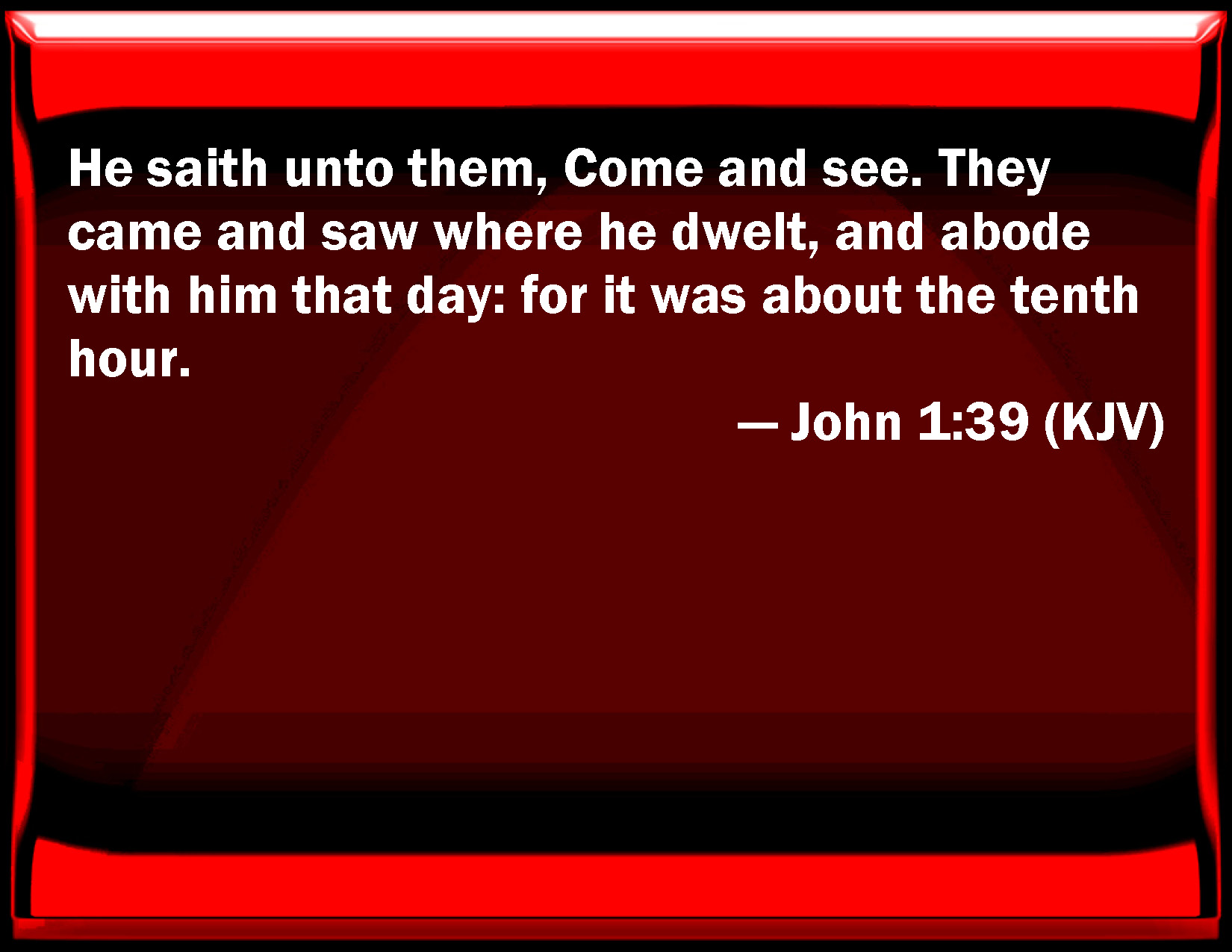 Bible Verse Slide John 1:39 He said to them, Come and see. They came and saw where he dwelled, and stayed with him that day: for it was about the tenth hour. KJV: He saith unto them, Come and see. They came and saw where he dwelt, and abode with him that day: for it was about the tenth hour. DRB: He saith to them: Come and see. They came, and saw where he abode, and they stayed with him that day: now it was about the tenth hour. DBT: He says to them, Come and see. They went therefore, and saw where he abode; and they abode with him that day. It was about the tenth hour. ERV: He saith unto them, Come, and ye shall see. They came therefore and saw where he abode; and they abode with him that day: it was about the tenth hour. WBT: He saith to them, Come and see. They came and saw where he dwelt, and abode with him that day: for it was about the tenth hour. WEB: He said to them, "Come, and see." They came and saw where he was staying, and they stayed with him that day. It was about the tenth hour. YLT: He saith to them, 'Come and see;' they came, and saw where he doth remain, and with him they remained that day and the hour was about the tenth.Links John 1:39 NIV • John 1:39 NLT • John 1:39 ESV • John 1:39 NASB • John 1:39 KJV • John 1:39 Interlinear • John 1:39 Commentaries • John 1:39 Parallel Texts • John 1:39 Bible Apps • John 1:39 Parallel • Bible Hub |