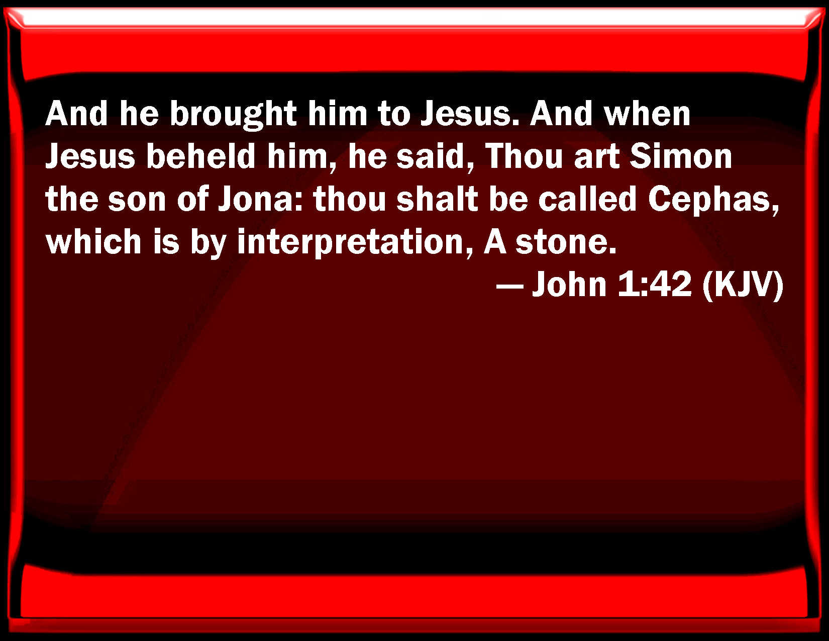 Bible Verse Slide John 1:42 And he brought him to Jesus. And when Jesus beheld him, he said, You are Simon the son of Jona: you shall be called Cephas, which is by interpretation, A stone. KJV: And he brought him to Jesus. And when Jesus beheld him, he said, Thou art Simon the son of Jona: thou shalt be called Cephas, which is by interpretation, A stone. DRB: And he brought him to Jesus. And Jesus looking upon him, said: Thou art Simon the son of Jona: thou shalt be called Cephas, which is interpreted Peter. DBT: And he led him to Jesus. Jesus looking at him said, Thou art Simon, the son of Jonas; thou shalt be called Cephas (which interpreted is stone). ERV: He brought him unto Jesus. Jesus looked upon him, and said, Thou art Simon the son of John: thou shalt be called Cephas (which is by interpretation, Peter). WBT: And he brought him to Jesus. And when Jesus beheld him, he said, Thou art Simon the son of Jona: thou shalt be called Cephas; which is, by interpretation, a stone. WEB: He brought him to Jesus. Jesus looked at him, and said, "You are Simon the son of Jonah. You shall be called Cephas" (which is by interpretation, Peter). YLT: and he brought him unto Jesus: and having looked upon him, Jesus saith, 'Thou art Simon, the son of Jonas, thou shalt be called Cephas,' (which is interpreted, A rock.)Links John 1:42 NIV • John 1:42 NLT • John 1:42 ESV • John 1:42 NASB • John 1:42 KJV • John 1:42 Interlinear • John 1:42 Commentaries • John 1:42 Parallel Texts • John 1:42 Bible Apps • John 1:42 Parallel • Bible Hub |