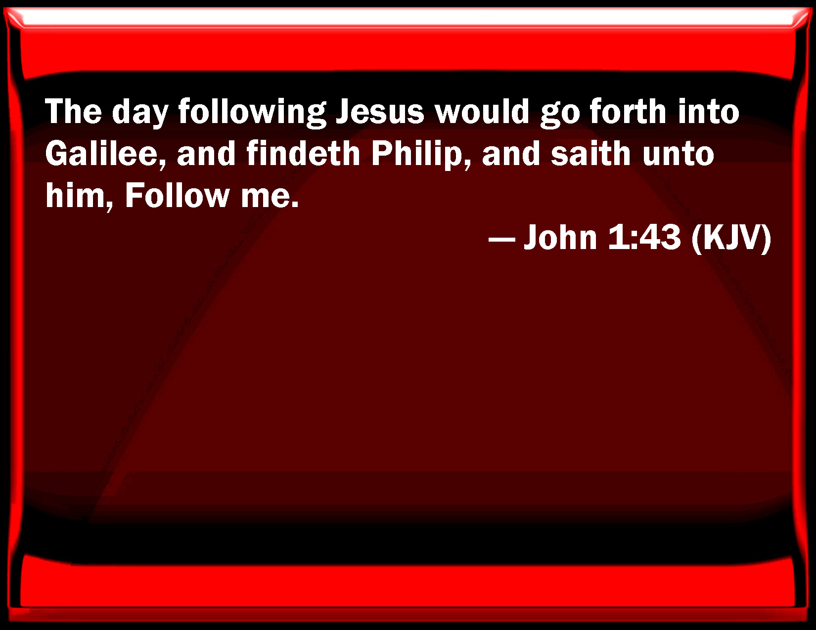 Bible Verse Slide John 1:43 The day following Jesus would go forth into Galilee, and finds Philip, and said to him, Follow me. KJV: The day following Jesus would go forth into Galilee, and findeth Philip, and saith unto him, Follow me. DRB: On the following day, he would go forth into Galilee, and he findeth Philip. And Jesus saith to him: Follow me. DBT: On the morrow he would go forth into Galilee, and Jesus finds Philip, and says to him, Follow me. ERV: On the morrow he was minded to go forth into Galilee, and he findeth Philip: and Jesus saith unto him, Follow me. WBT: The day following Jesus would go forth into Galilee, and findeth Philip, and saith to him, follow me. WEB: On the next day, he was determined to go out into Galilee, and he found Philip. Jesus said to him, "Follow me." YLT: On the morrow, he willed to go forth to Galilee, and he findeth Philip, and saith to him, 'Be following me.'Links John 1:43 NIV • John 1:43 NLT • John 1:43 ESV • John 1:43 NASB • John 1:43 KJV • John 1:43 Interlinear • John 1:43 Commentaries • John 1:43 Parallel Texts • John 1:43 Bible Apps • John 1:43 Parallel • Bible Hub |