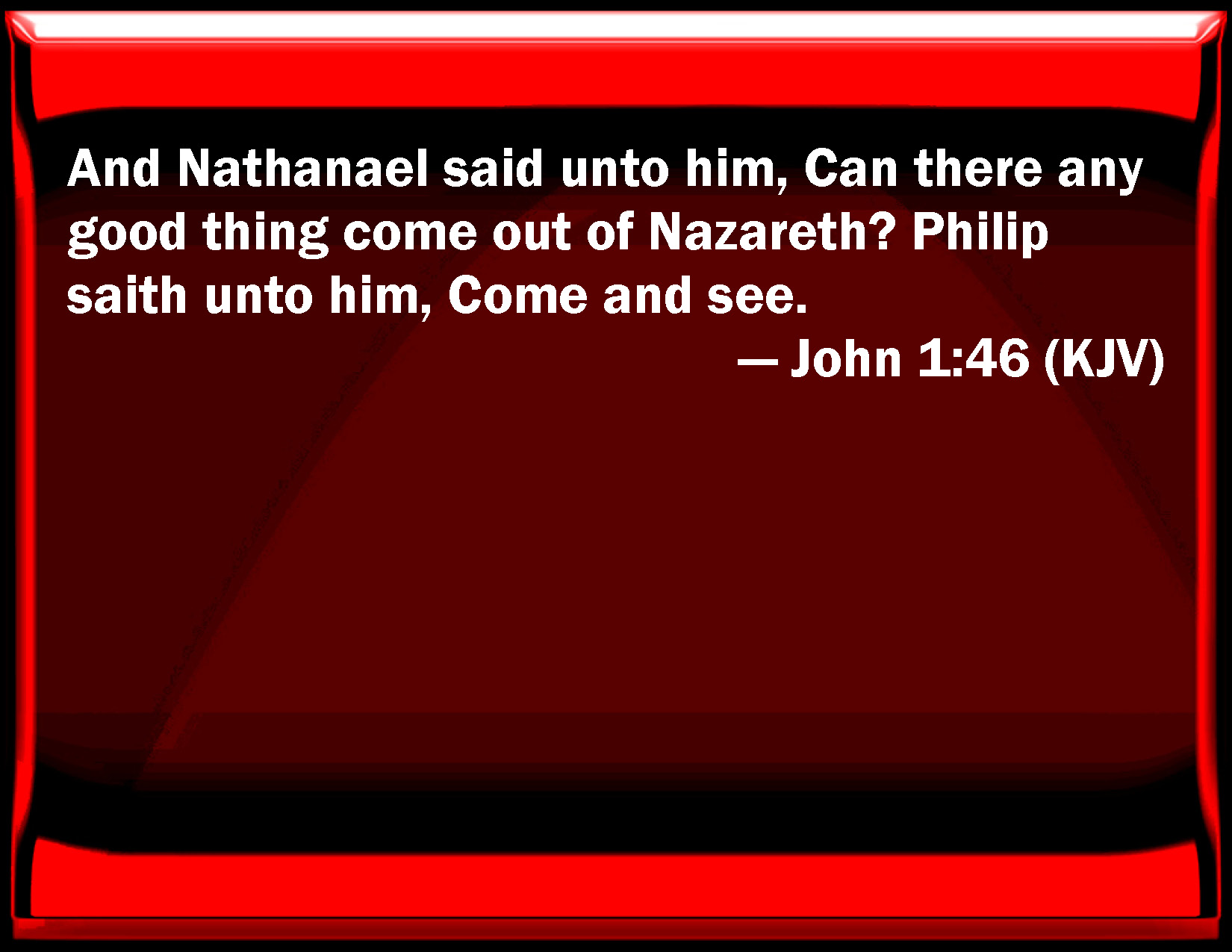 Bible Verse Slide John 1:46 And Nathanael said to him, Can there any good thing come out of Nazareth? Philip said to him, Come and see. KJV: And Nathanael said unto him, Can there any good thing come out of Nazareth? Philip saith unto him, Come and see. DRB: And Nathanael said to him: Can any thing of good come from Nazareth? Philip saith to him: Come and see. DBT: And Nathanael said to him, Can anything good come out of Nazareth? Philip says to him, Come and see. ERV: And Nathanael said unto him, Can any good thing come out of Nazareth? Philip saith unto him, Come and see. WBT: And Nathanael said to him, Can there any good thing come out of Nazareth? Philip saith to him, Come and see. WEB: Nathanael said to him, "Can any good thing come out of Nazareth?" Philip said to him, "Come and see." YLT: and Nathanael said to him, 'Out of Nazareth is any good thing able to be?' Philip said to him, 'Come and see.'Links John 1:46 NIV • John 1:46 NLT • John 1:46 ESV • John 1:46 NASB • John 1:46 KJV • John 1:46 Interlinear • John 1:46 Commentaries • John 1:46 Parallel Texts • John 1:46 Bible Apps • John 1:46 Parallel • Bible Hub |