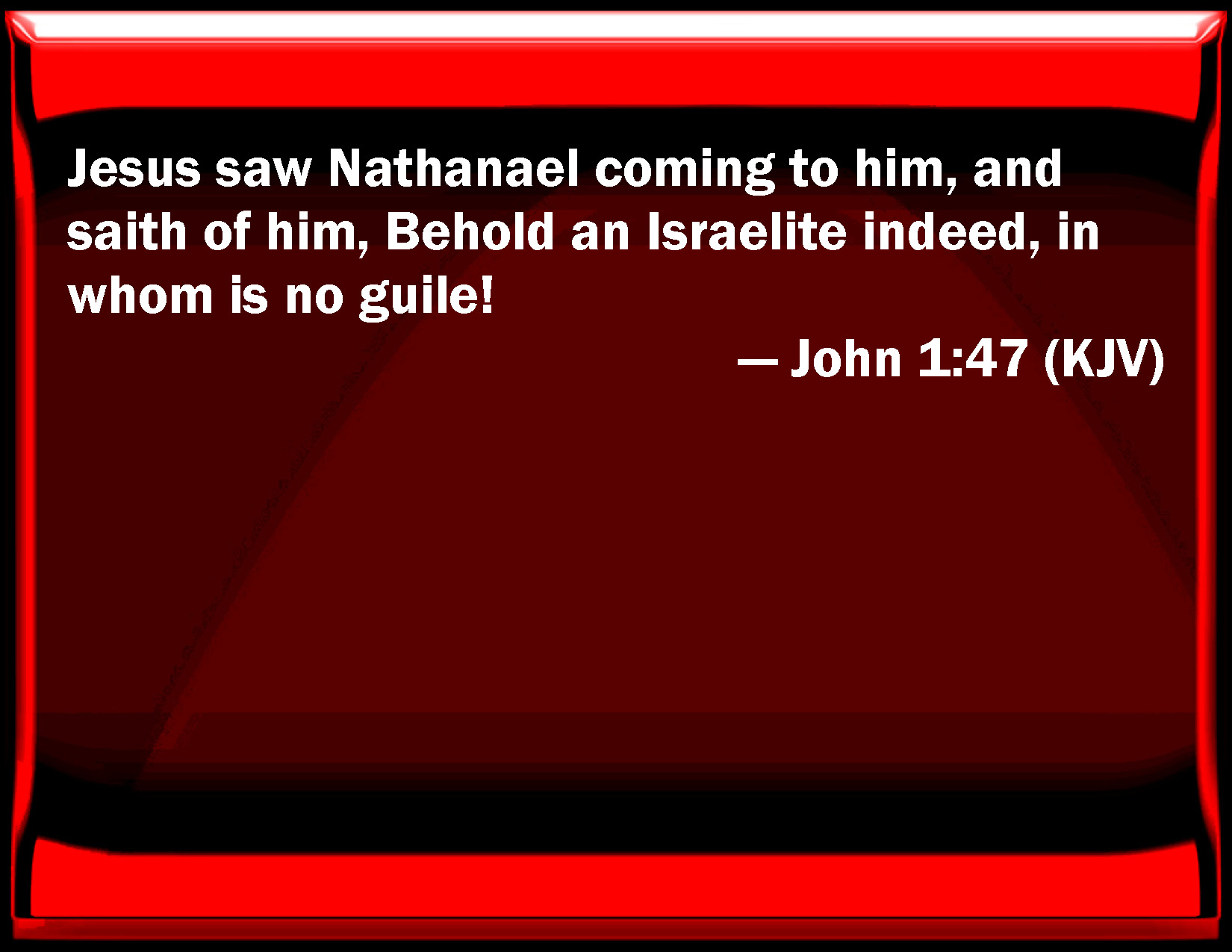 Bible Verse Slide John 1:47 Jesus saw Nathanael coming to him, and said of him, Behold an Israelite indeed, in whom is no guile! KJV: Jesus saw Nathanael coming to him, and saith of him, Behold an Israelite indeed, in whom is no guile! DRB: Jesus saw Nathanael coming to him: and he saith of him: Behold an Israelite indeed, in whom there is no guile. DBT: Jesus saw Nathanael coming to him, and says of him, Behold one truly an Israelite, in whom there is no guile. ERV: Jesus saw Nathanael coming to him, and saith of him, Behold, an Israelite indeed, in whom is no guile! WBT: Jesus saw Nathanael coming to him, and saith of him, Behold an Israelite indeed, in whom is no guile! WEB: Jesus saw Nathanael coming to him, and said about him, "Behold, an Israelite indeed, in whom is no deceit!" YLT: Jesus saw Nathanael coming unto him, and he saith concerning him, 'Lo, truly an Israelite, in whom guile is not;'Links John 1:47 NIV • John 1:47 NLT • John 1:47 ESV • John 1:47 NASB • John 1:47 KJV • John 1:47 Interlinear • John 1:47 Commentaries • John 1:47 Parallel Texts • John 1:47 Bible Apps • John 1:47 Parallel • Bible Hub |