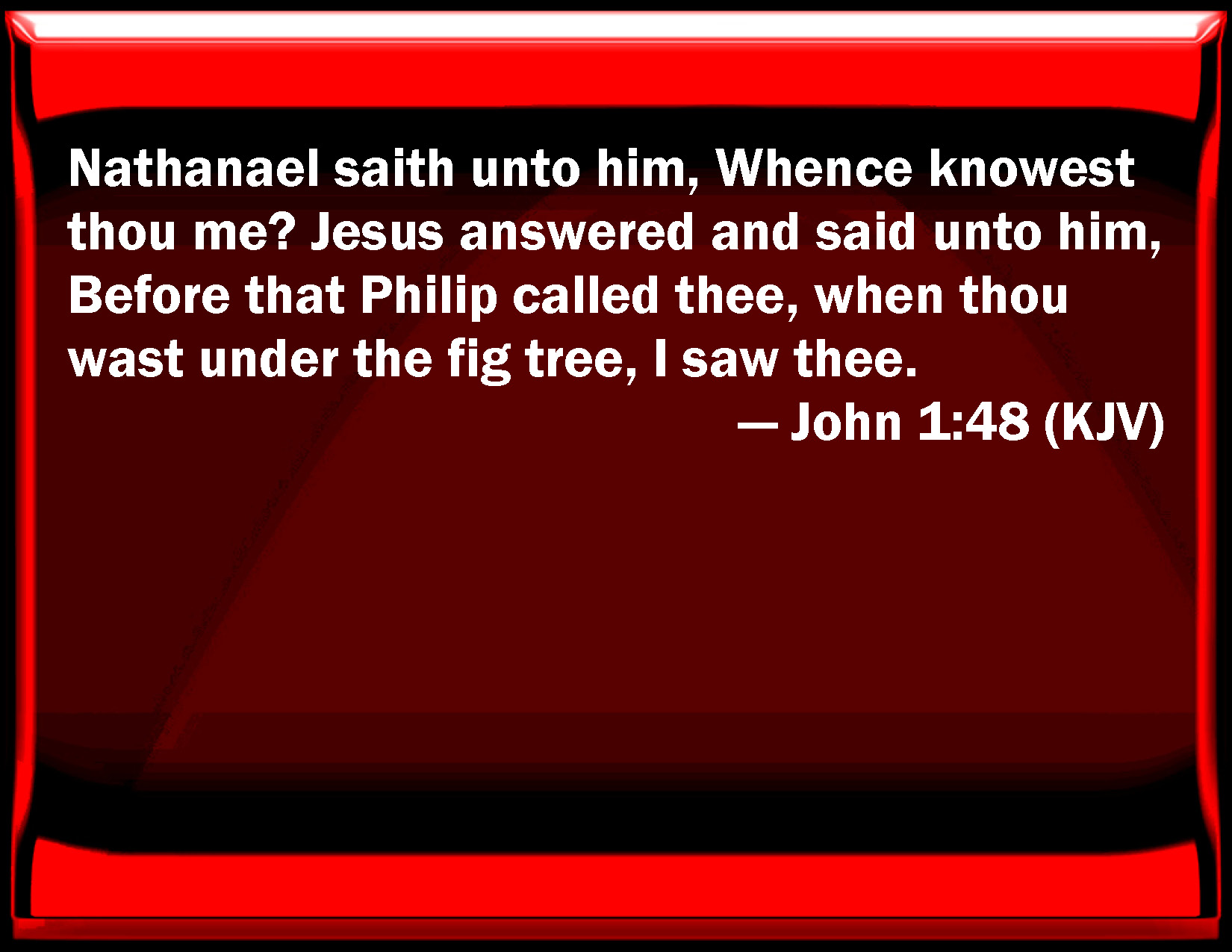 Bible Verse Slide John 1:48 Nathanael said to him, From where know you me? Jesus answered and said to him, Before that Philip called you, when you were under the fig tree, I saw you. KJV: Nathanael saith unto him, Whence knowest thou me? Jesus answered and said unto him, Before that Philip called thee, when thou wast under the fig tree, I saw thee. DRB: Nathanael saith to him: Whence knowest thou me? Jesus answered, and said to him: Before that Philip called thee, when thou wast under the fig tree, I saw thee. DBT: Nathanael says to him, Whence knowest thou me? Jesus answered and said to him, Before that Philip called thee, when thou wast under the fig-tree, I saw thee. ERV: Nathanael saith unto him, Whence knowest thou me? Jesus answered and said unto him, Before Philip called thee, when thou wast under the fig tree, I saw thee. WBT: Nathanael saith to him, Whence knowest thou me? Jesus answered and said to him, Before Philip called thee, when thou wast under the fig-tree, I saw thee. WEB: Nathanael said to him, "How do you know me?" Jesus answered him, "Before Philip called you, when you were under the fig tree, I saw you." YLT: Nathanael saith to him, 'Whence me dost thou know?' Jesus answered and said to him, 'Before Philip's calling thee — thou being under the fig-tree — I saw thee.'Links John 1:48 NIV • John 1:48 NLT • John 1:48 ESV • John 1:48 NASB • John 1:48 KJV • John 1:48 Interlinear • John 1:48 Commentaries • John 1:48 Parallel Texts • John 1:48 Bible Apps • John 1:48 Parallel • Bible Hub |