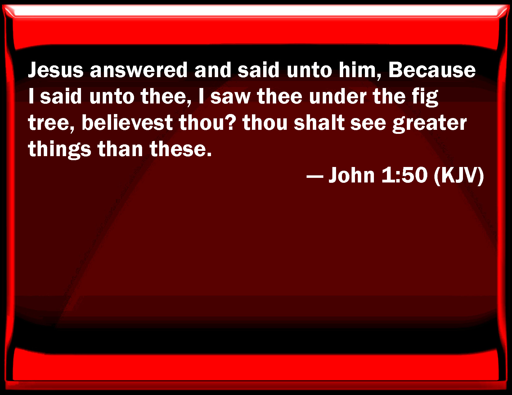 Bible Verse Slide John 1:50 Jesus answered and said to him, Because I said to you, I saw you under the fig tree, believe you? you shall see greater things than these. KJV: Jesus answered and said unto him, Because I said unto thee, I saw thee under the fig tree, believest thou? thou shalt see greater things than these. DRB: Jesus answered, and said to him: Because I said unto thee, I saw thee under the fig tree, thou believest: greater things than these shalt thou see. DBT: Jesus answered and said to him, Because I said to thee, I saw thee under the fig-tree, believest thou? Thou shalt see greater things than these. ERV: Jesus answered and said unto him, Because I said unto thee, I saw thee underneath the fig tree, believest thou? thou shalt see greater things than these. WBT: Jesus answered and said to him, Because I said to thee, I saw thee under the fig-tree, dost thou believe? thou shalt see greater things than these. WEB: Jesus answered him, "Because I told you, 'I saw you underneath the fig tree,' do you believe? You will see greater things than these!" YLT: Jesus answered and said to him, 'Because I said to thee, I saw thee under the fig-tree, thou dost believe; greater things than these thou shalt see;'Links John 1:50 NIV • John 1:50 NLT • John 1:50 ESV • John 1:50 NASB • John 1:50 KJV • John 1:50 Interlinear • John 1:50 Commentaries • John 1:50 Parallel Texts • John 1:50 Bible Apps • John 1:50 Parallel • Bible Hub |
