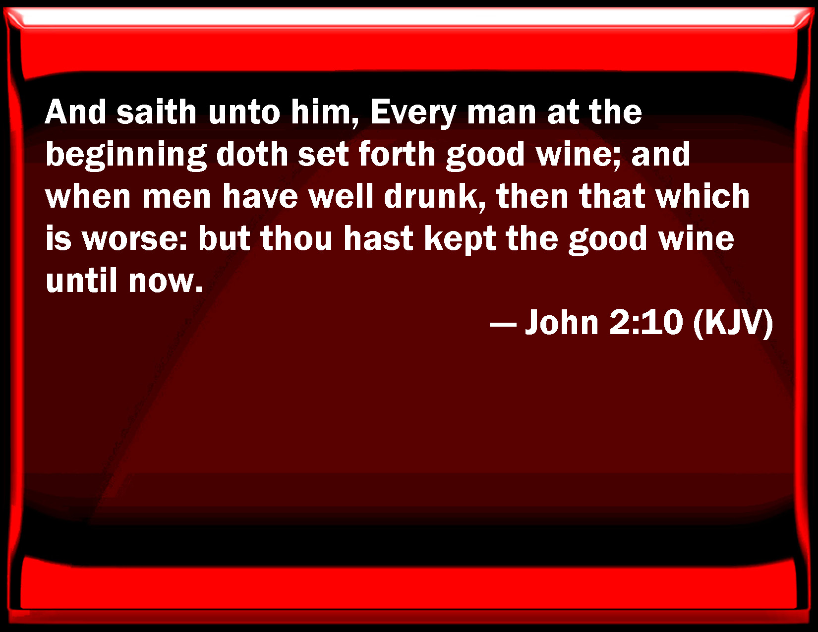 Bible Verse Slide John 2:10 And said to him, Every man at the beginning does set forth good wine; and when men have well drunk, then that which is worse: but you have kept the good wine until now. KJV: And saith unto him, Every man at the beginning doth set forth good wine; and when men have well drunk, then that which is worse: but thou hast kept the good wine until now. DRB: And saith to him: Every man at first setteth forth good wine, and when men have well drunk, then that which is worse. But thou hast kept the good wine until now. DBT: and says to him, Every man sets on first the good wine, and when men have well drunk, then the inferior; thou hast kept the good wine till now. ERV: and saith unto him, Every man setteth on first the good wine; and when men have drunk freely, then that which is worse: thou hast kept the good wine until now. WBT: And saith to him, Every man at the beginning presenteth good wine; and when men have well drank, then that which is worse: but thou hast kept the good wine until now. WEB: and said to him, "Everyone serves the good wine first, and when the guests have drunk freely, then that which is worse. You have kept the good wine until now!" YLT: and saith to him, 'Every man, at first, the good wine doth set forth; and when they may have drunk freely, then the inferior; thou didst keep the good wine till now.'Links John 2:10 NIV • John 2:10 NLT • John 2:10 ESV • John 2:10 NASB • John 2:10 KJV • John 2:10 Interlinear • John 2:10 Commentaries • John 2:10 Parallel Texts • John 2:10 Bible Apps • John 2:10 Parallel • Bible Hub |