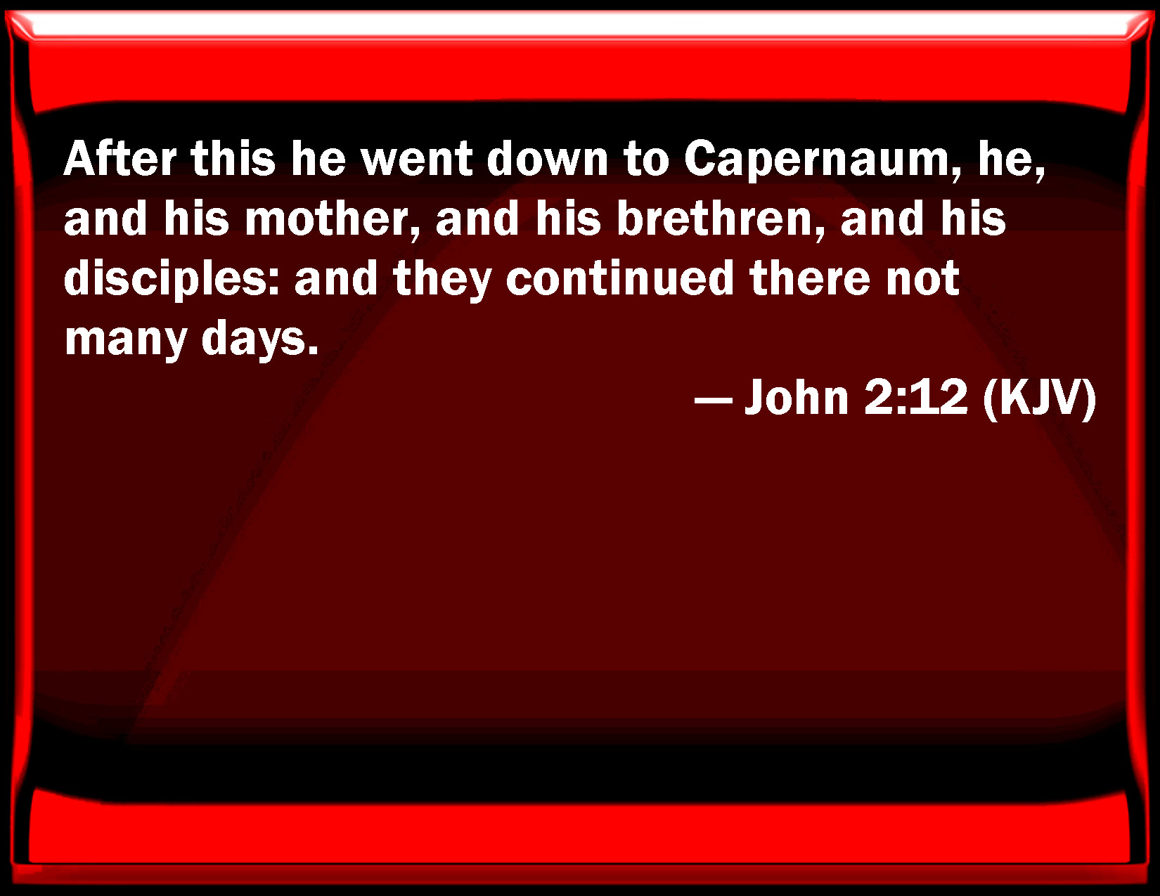 Bible Verse Slide John 2:12 After this he went down to Capernaum, he, and his mother, and his brothers, and his disciples: and they continued there not many days. KJV: After this he went down to Capernaum, he, and his mother, and his brethren, and his disciples: and they continued there not many days. DRB: After this he went down to Capharnaum, he and his mother, and his brethren, and his disciples: and they remained there not many days. DBT: After this he descended to Capernaum, he and his mother and his brethren and his disciples; and there they abode not many days. ERV: After this he went down to Capernaum, he, and his mother, and his brethren, and his disciples: and there they abode not many days. WBT: After this he went down to Capernaum, he, and his mother, and his brethren, and his disciples; and they continued there not many days. WEB: After this, he went down to Capernaum, he, and his mother, his brothers, and his disciples; and they stayed there a few days. YLT: after this he went down to Capernaum, he, and his mother, and his brethren, and his disciples; and there they remained not many days.Links John 2:12 NIV • John 2:12 NLT • John 2:12 ESV • John 2:12 NASB • John 2:12 KJV • John 2:12 Interlinear • John 2:12 Commentaries • John 2:12 Parallel Texts • John 2:12 Bible Apps • John 2:12 Parallel • Bible Hub |