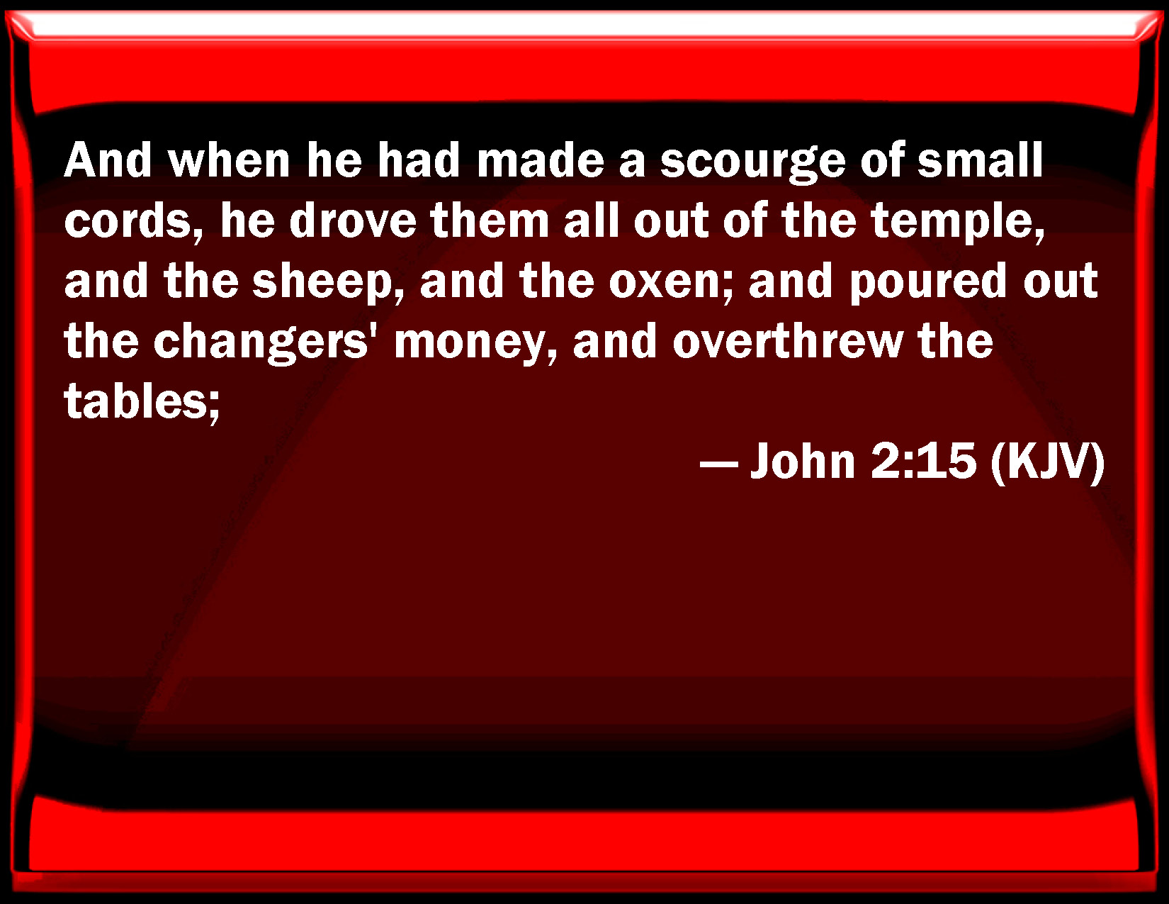 Bible Verse Slide John 2:15 And when he had made a whip of small cords, he drove them all out of the temple, and the sheep, and the oxen; and poured out the changers' money, and overthrew the tables; KJV: And when he had made a scourge of small cords, he drove them all out of the temple, and the sheep, and the oxen; and poured out the changers' money, and overthrew the tables; DRB: And when he had made, as it were, a scourge of little cords, he drove them all out of the temple, the sheep also and the oxen, and the money of the changers he poured out, and the tables he overthrew. DBT: and, having made a scourge of cords, he cast them all out of the temple, both the sheep and the oxen; and he poured out the change of the money-changers, and overturned the tables, ERV: and he made a scourge of cords, and cast all out of the temple, both the sheep and the oxen; and he poured out the changers' money, and overthrew their tables; WBT: And when he had made a scourge of small cords, he drove them all out of the temple, and the sheep, and the oxen; and poured out the changers' money, and overthrew the tables; WEB: He made a whip of cords, and threw all out of the temple, both the sheep and the oxen; and he poured out the changers' money, and overthrew their tables. YLT: and having made a whip of small cords, he put all forth out of the temple, also the sheep, and the oxen; and of the money-changers he poured out the coins, and the tables he overthrew,Links John 2:15 NIV • John 2:15 NLT • John 2:15 ESV • John 2:15 NASB • John 2:15 KJV • John 2:15 Interlinear • John 2:15 Commentaries • John 2:15 Parallel Texts • John 2:15 Bible Apps • John 2:15 Parallel • Bible Hub |