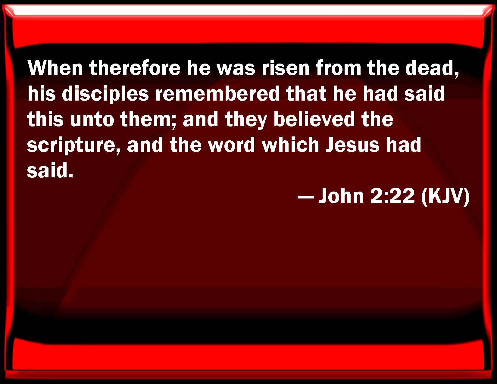 Bible Verse Slide John 2:22 When therefore he was risen from the dead, his disciples remembered that he had said this to them; and they believed the scripture, and the word which Jesus had said. KJV: When therefore he was risen from the dead, his disciples remembered that he had said this unto them; and they believed the scripture, and the word which Jesus had said. DRB: When therefore he was risen again from the dead, his disciples remembered, that he had said this, and they believed the scripture, and the word that Jesus had said. DBT: When therefore he was raised from among the dead, his disciples remembered that he had said this, and believed the scripture and the word which Jesus had spoken. ERV: When therefore he was raised from the dead, his disciples remembered that he spake this; and they believed the scripture, and the word which Jesus had said. WBT: When therefore he had risen from the dead, his disciples remembered that he had said this to them: and they believed the scripture, and the word which Jesus had spoken. WEB: When therefore he was raised from the dead, his disciples remembered that he said this, and they believed the Scripture, and the word which Jesus had said. YLT: when, then, he was raised out of the dead, his disciples remembered that he said this to them, and they believed the Writing, and the word that Jesus said.Links John 2:22 NIV • John 2:22 NLT • John 2:22 ESV • John 2:22 NASB • John 2:22 KJV • John 2:22 Interlinear • John 2:22 Commentaries • John 2:22 Parallel Texts • John 2:22 Bible Apps • John 2:22 Parallel • Bible Hub |