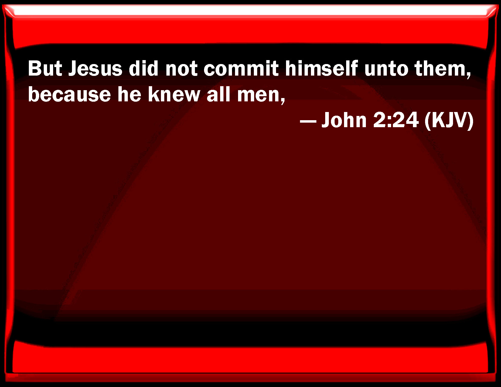 Bible Verse Slide John 2:24 But Jesus did not commit himself to them, because he knew all men, KJV: But Jesus did not commit himself unto them, because he knew all men, DRB: But Jesus did not trust himself unto them, for that he knew all men, DBT: But Jesus himself did not trust himself to them, because he knew all men, ERV: But Jesus did not trust himself unto them, for that he knew all men, WBT: But Jesus did not commit himself to them, because he knew all men. WEB: But Jesus didn't trust himself to them, because he knew everyone, YLT: and Jesus himself was not trusting himself to them, because of his knowing all men,Links John 2:24 NIV • John 2:24 NLT • John 2:24 ESV • John 2:24 NASB • John 2:24 KJV • John 2:24 Interlinear • John 2:24 Commentaries • John 2:24 Parallel Texts • John 2:24 Bible Apps • John 2:24 Parallel • Bible Hub |