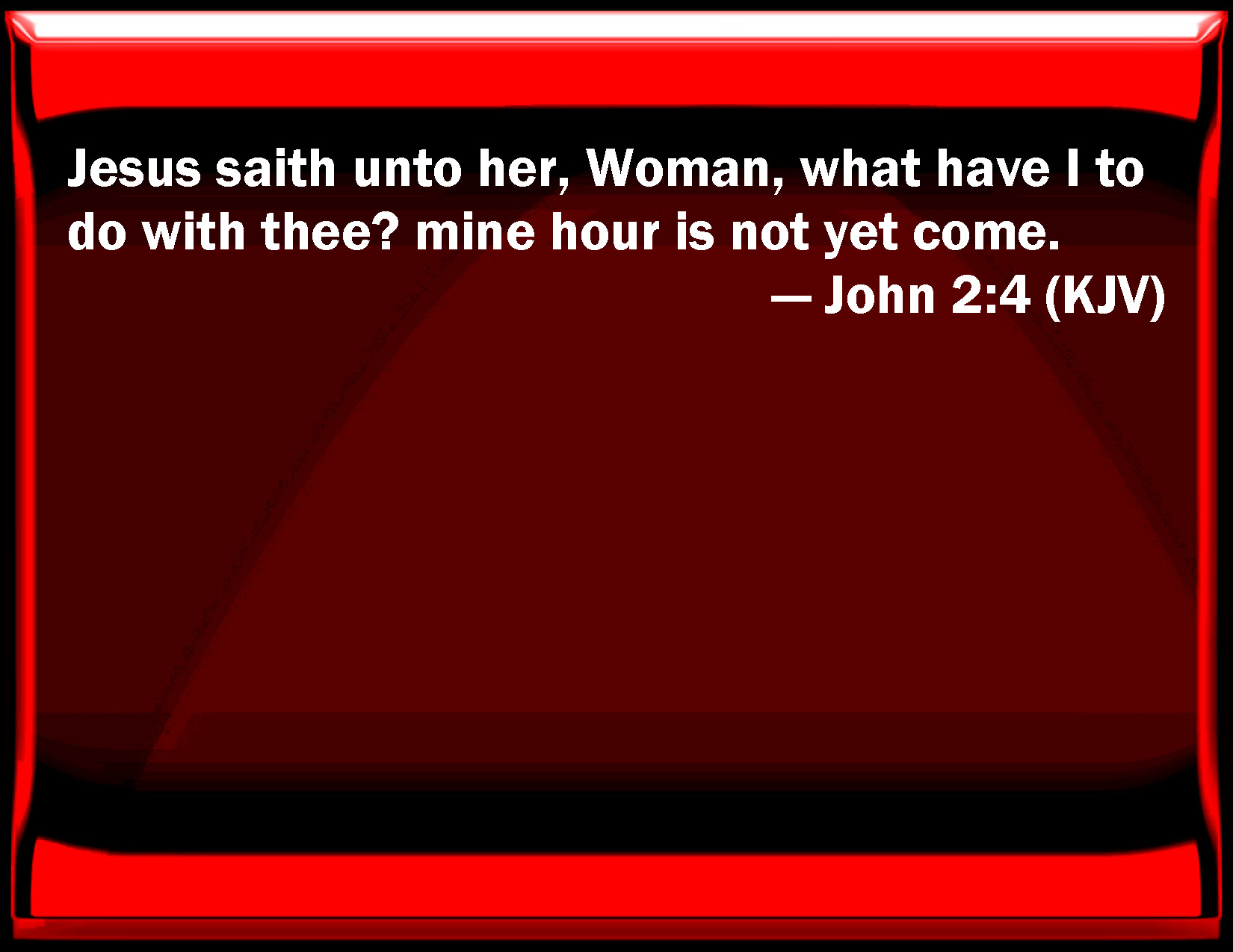 Bible Verse Slide John 2:4 Jesus said to her, Woman, what have I to do with you? my hour is not yet come. KJV: Jesus saith unto her, Woman, what have I to do with thee? mine hour is not yet come. DRB: And Jesus saith to her: Woman, what is that to me and to thee? my hour is not yet come. DBT: Jesus says to her, What have I to do with thee, woman? mine hour has not yet come. ERV: And Jesus saith unto her, Woman, what have I to do with thee? mine hour is not yet come. WBT: Jesus saith to her, Woman, what have I to do with thee? my hour is not yet come. WEB: Jesus said to her, "Woman, what does that have to do with you and me? My hour has not yet come." YLT: Jesus saith to her, 'What — to me and to thee, woman? not yet is mine hour come.'Links John 2:4 NIV • John 2:4 NLT • John 2:4 ESV • John 2:4 NASB • John 2:4 KJV • John 2:4 Interlinear • John 2:4 Commentaries • John 2:4 Parallel Texts • John 2:4 Bible Apps • John 2:4 Parallel • Bible Hub |