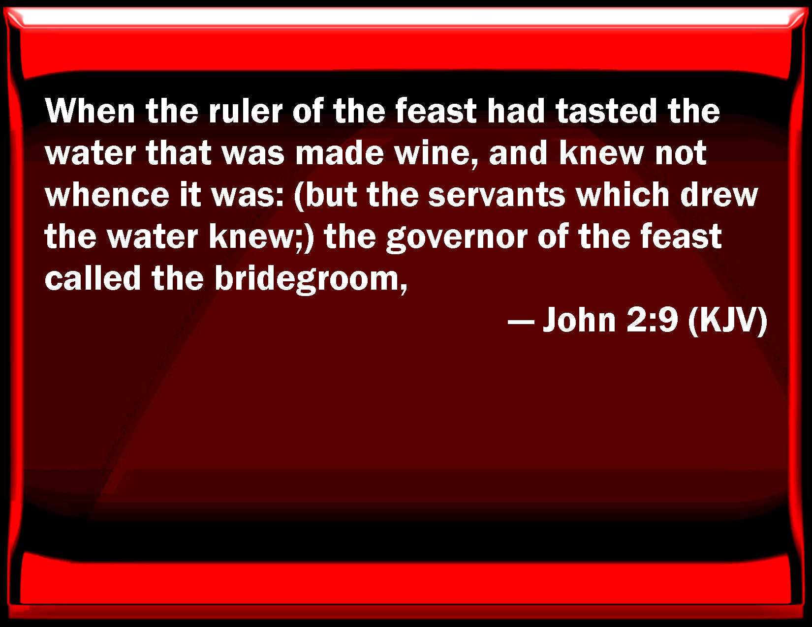Bible Verse Slide John 2:9 When the ruler of the feast had tasted the water that was made wine, and knew not from where it was: (but the servants which drew the water knew;) the governor of the feast called the bridegroom, KJV: When the ruler of the feast had tasted the water that was made wine, and knew not whence it was: (but the servants which drew the water knew;) the governor of the feast called the bridegroom, DRB: And when the chief steward had tasted the water made wine, and knew not whence it was, but the waiters knew who had drawn the water; the chief steward calleth the bridegroom, DBT: But when the feast-master had tasted the water which had been made wine (and knew not whence it was, but the servants knew who drew the water), the feast-master calls the bridegroom, ERV: And when the ruler of the feast tasted the water now become wine, and knew not whence it was (but the servants which had drawn the water knew), the ruler of the feast calleth the bridegroom, WBT: When the ruler of the feast had tasted the water that was made wine, and knew not whence it was; (but the servants who drew the water knew) the governor of the feast called the bridegroom, WEB: When the ruler of the feast tasted the water now become wine, and didn't know where it came from (but the servants who had drawn the water knew), the ruler of the feast called the bridegroom, YLT: And as the director of the apartment tasted the water become wine, and knew not whence it is, (but the ministrants knew, who have drawn the water,) the director of the feast doth call the bridegroom,Links John 2:9 NIV • John 2:9 NLT • John 2:9 ESV • John 2:9 NASB • John 2:9 KJV • John 2:9 Interlinear • John 2:9 Commentaries • John 2:9 Parallel Texts • John 2:9 Bible Apps • John 2:9 Parallel • Bible Hub |